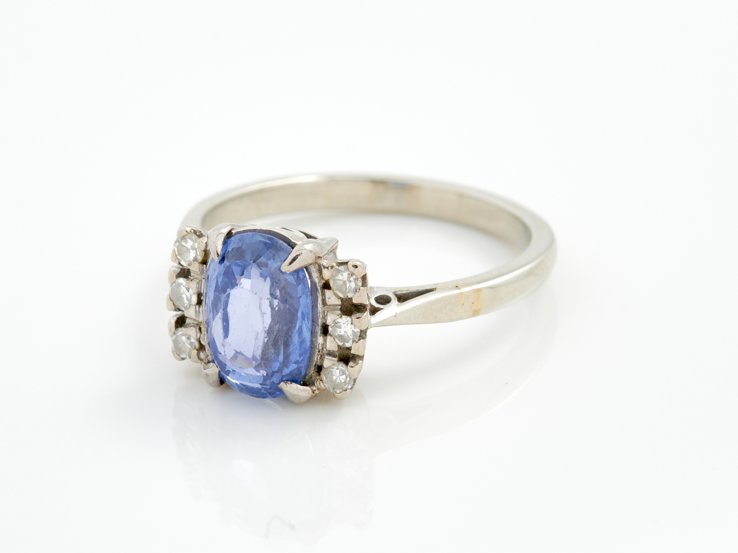 A SYNTHETIC SAPPHIRE AND DIAMOND RING IN PLATINUM AND 18CT WHITE GOLD, SIZE O, 4.6GMS