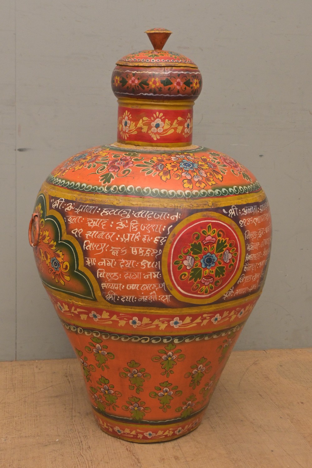 A LARGE INDIAN COPPER URN WITH HAND PAINTED FLOWER DECORATION (A/F) (100H X 52W CM) (LEONARD JOEL DELIVERY SIZE: LARGE)