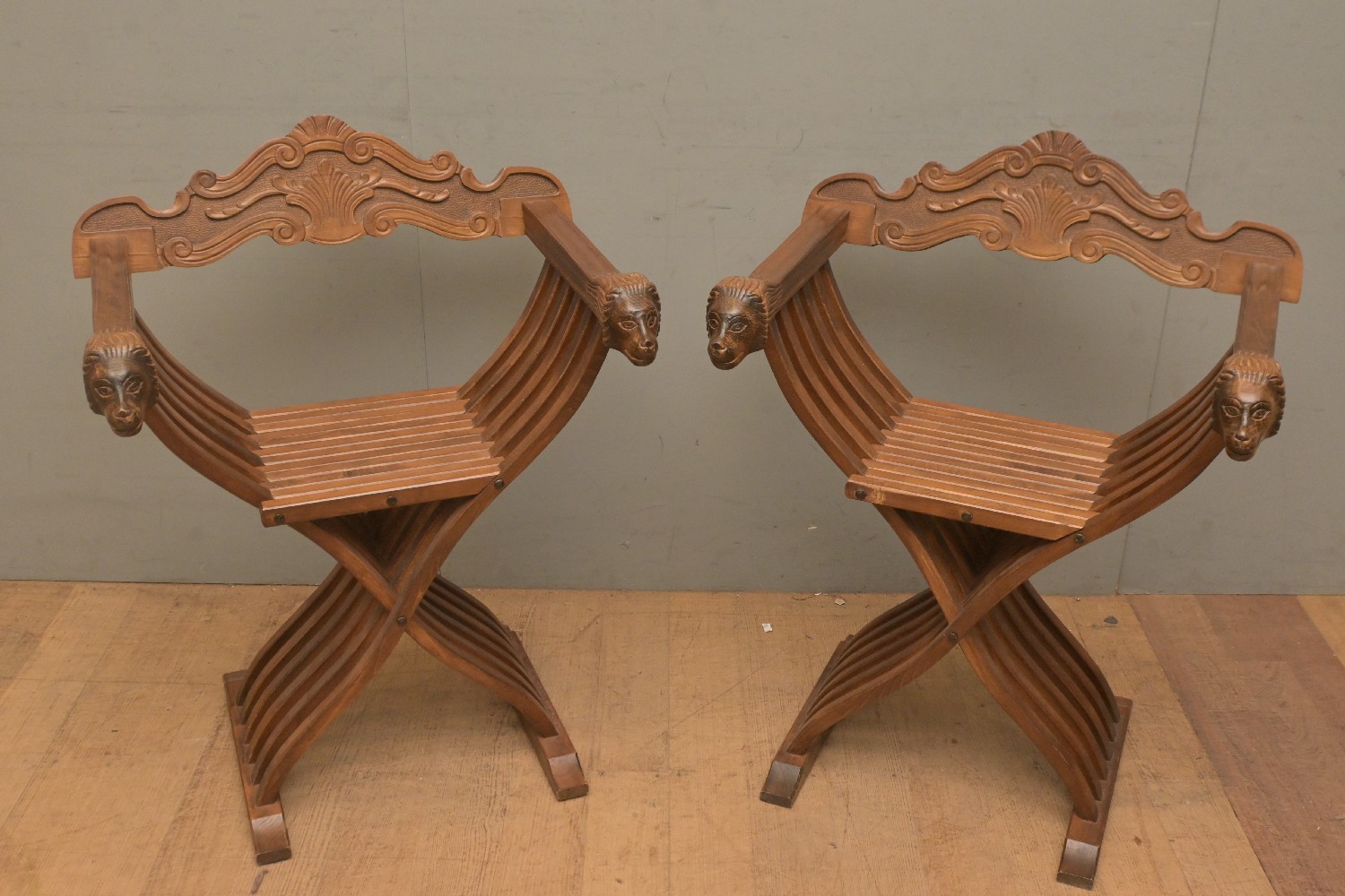 A PAIR OF HARDWOOD 'SAVANAROLA' CHAIRS (A/F) (81H X 64W X 48D CM) (LEONARD JOEL DELIVERY SIZE: X-LARGE)