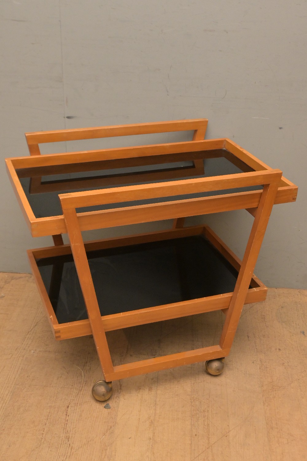 A MID-CENTURY TEAK & GLASS TWO TIER DRINKS TROLLEY (67H X 76W X 51D CM) (LEONARD JOEL DELIVERY SIZE: X-LARGE)