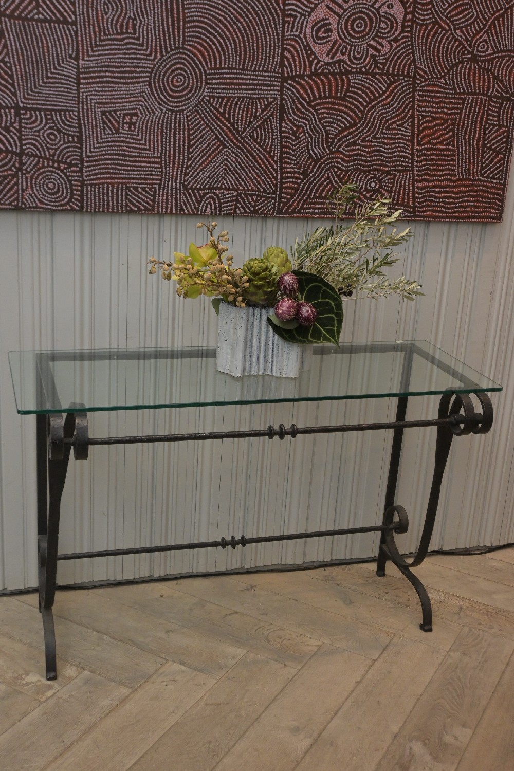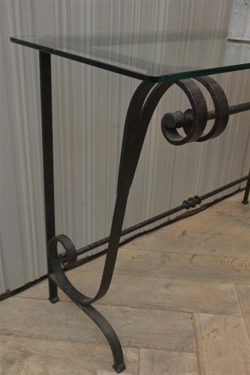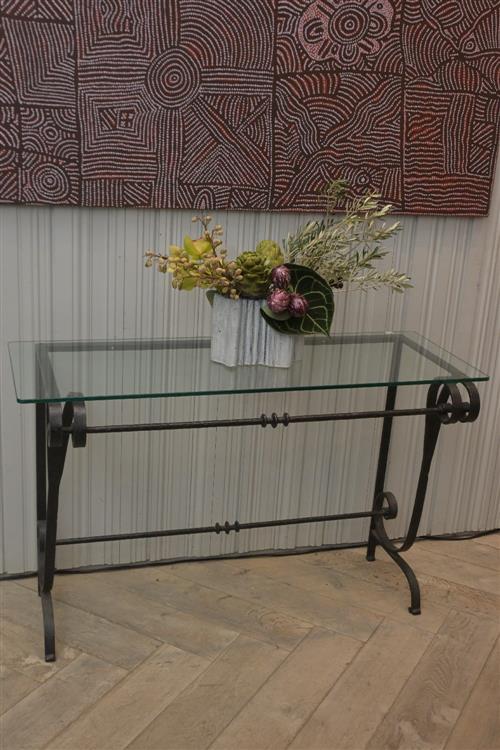 A WROUGHT IRON GLASS TOP CONSOLE TABLE (75H X 116W X 46D CM) (LEONARD JOEL DELIVERY SIZE: X-LARGE)