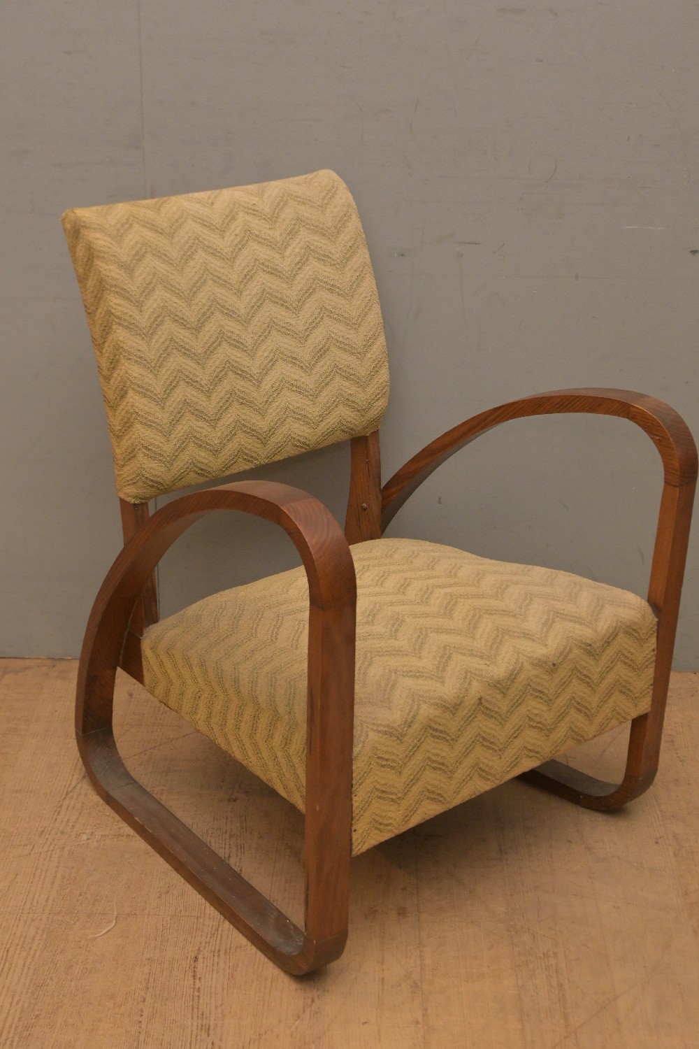 AN ART DECO UPHOLSTERED ARMCHAIR (A/F) (76H X 57W X 60D CM) (LEONARD JOEL DELIVERY SIZE: LARGE)