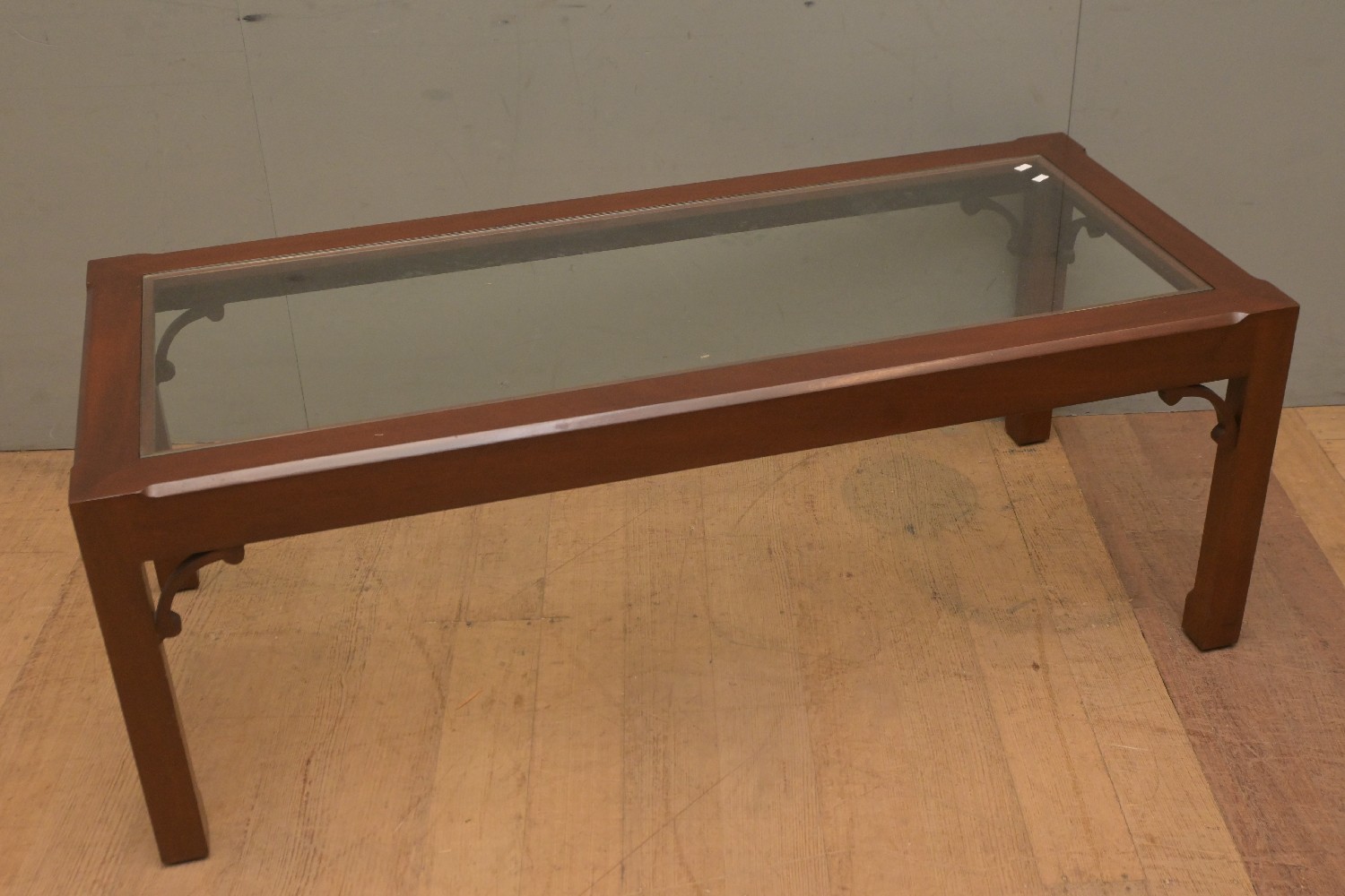 A WOOD FRAMED GLASS TOP COFFEE TABLE (47H X 127W X 56D CM) (LEONARD JOEL DELIVERY SIZE: X-LARGE)