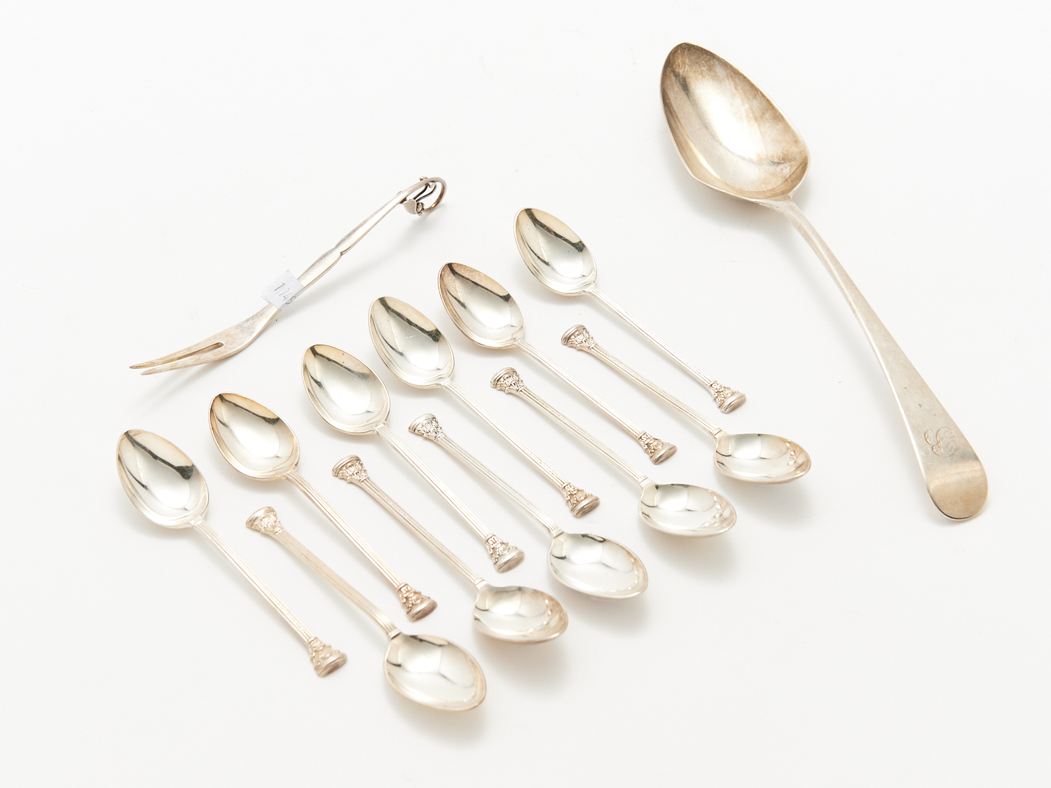 A GROUP OF ASSORTED STERLING SILVER INCLUDING A GEORG JENSEN PICKLE FORK, A GEORGIAN TABLE SPOON AND A SET OF ELEVEN COFFEE SPOONS (230g TOTAL), LEONARD JOEL DELIVERY SIZE: SMALL
