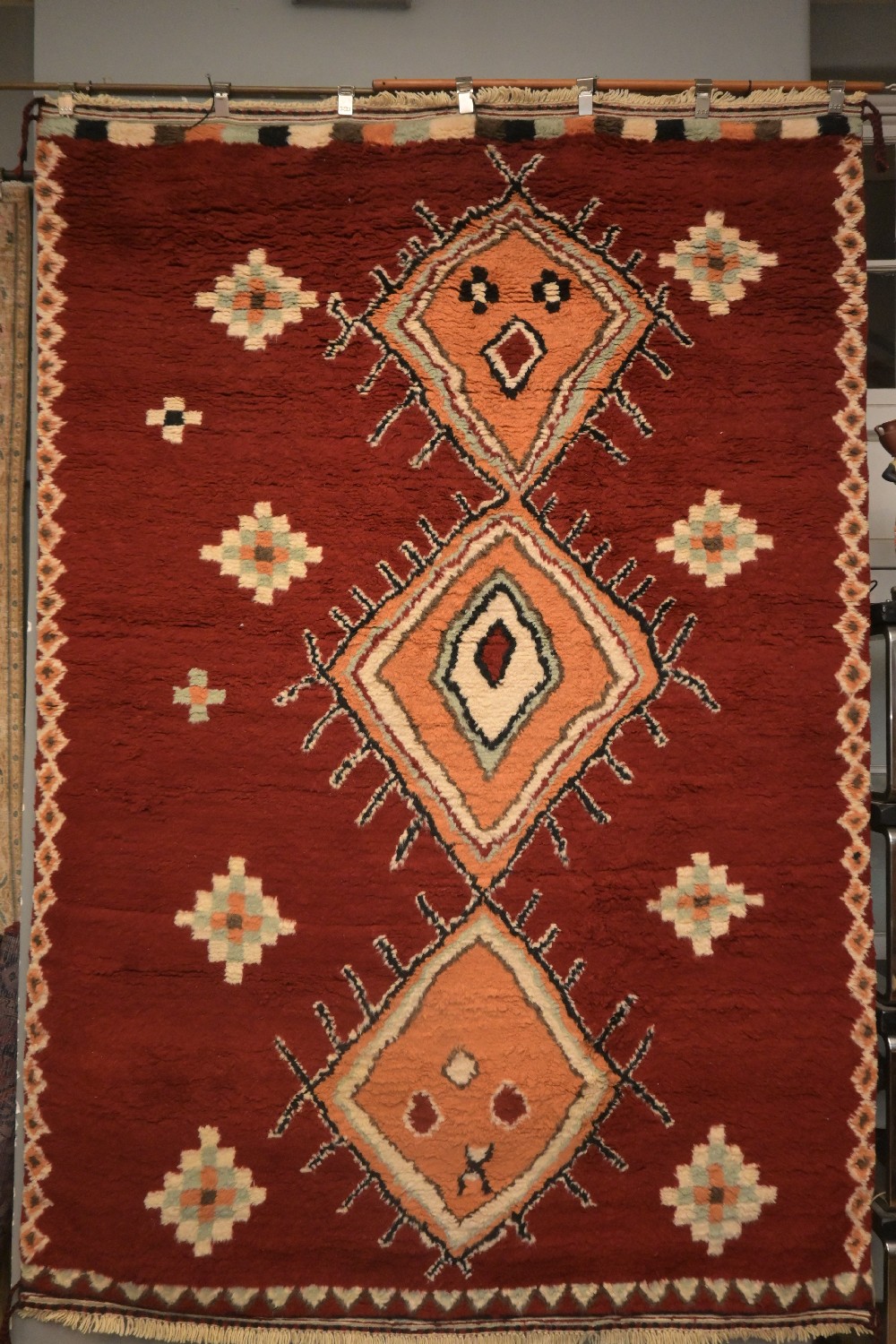 A BRAND-NEW MARRAKESH COLLECTION RUG, 100% WOOL -WARP-WEFT PILE, HAND KNOTTED. DECORATIVE- FASHIONABLE SOFT PLUSH PILE, WITH TRIPLE DIAMOND DESIGN ON A RUSTY RED FIELD. SIZE: 283 X 183 CM ORIGIN: INDIA – RRP: $1,900 DOCUMENTATION OF AUTHENTICITY INCLUDED.