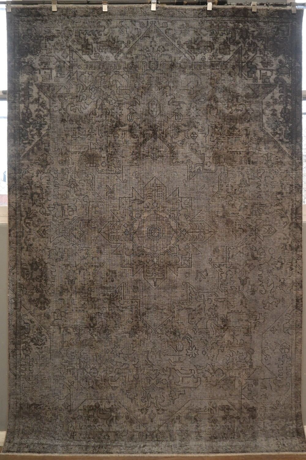 A CONTEMPORARY VINTAGE OVER-DYED PERSIAN TABRIZ RUG. ALL OVER PATTERN AND OVER-DYED IN CHARCOAL-GREY AND SILVER. AS ILLUSTRATED IN INTERIOR MAGAZINES. THESE LATEST PERSIAN CREATIONS REPRESENT THE MODERN STYLE OF TODAYS HIGH DEMAND FOR FASHION FLOORING TO ACHIEVE THAT FINAL TRANSITIONAL FINISH. SIZE: 321 X 214 CM ORIGIN: PERSIA - RRP: $3,200 DOCUMENTATION OF AUTHENTICITY INCLUDED.