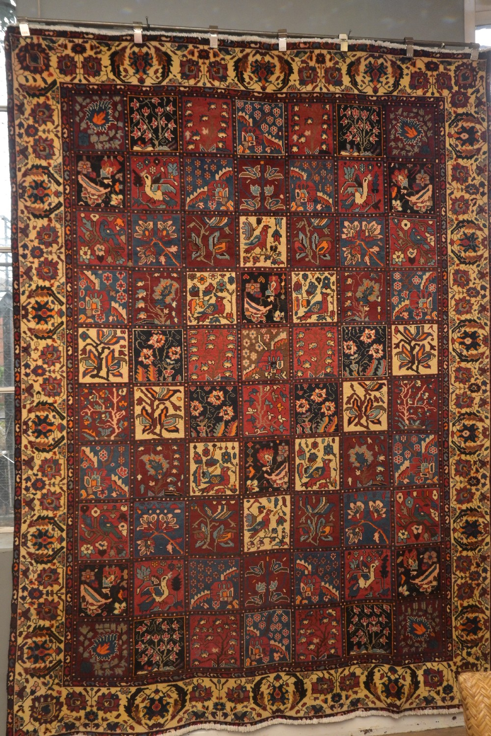 A VIBRANT PERSIAN BAKHTIARI RUG. 100% SOLID FINE WOOL, NATURAL DYES. HAND-KNOTTED TRIBAL BAKHTIARI WEAVE WITH TRADITIONAL "GARDEN " DESIGN WITH PANELS CONTAINING GARDEN THEMES OF TREE AND BIRD MOTIFS, FLORAL SHRUBS, PALMETTES AND GEOMETRIC MOTIFS. BORDER OF TRIBAL PALMETTES TENDRILS AND FLORAL MOTIFS. RICH ALL OVER TONES. SIZE: 300 X 220 CM ORIGIN: PERSIA – RRP: $4,500 DOCUMENTATION OF AUTHENTICITY INCLUDED.
