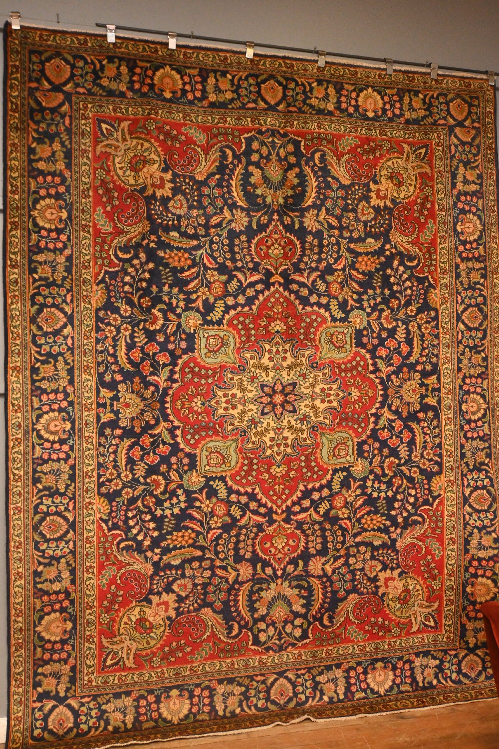 AN EX GALLERY, CIRCA 1970'S PERSIAN TABRIZ DANCING FLOWER DESIGN CARPET. 100% SOLID AND DENSE WOOL. CLASSIC TABRIZ DESIGN OF DOMINANT FLORAL ANCHORED MEDALLION IN RED TONES ON A ROYAL BLUE FIELD OF FLORAL SPRAYS, SAZ LEAVES AND PALMETTES WITH A HINT OF TURQUOISE. MAJOR BORDER OF FLORAL SPRAYS, TENDRILS PALMETTES IN A ROYAL BLUE FIELD. SEMI VINTAGE PILE. SOME MINOR RESTORATION -INSPECTION IS A MUST. SIZE: 325 X 247 CM ORIGIN: PERSIA - RRP: $4,200 DOCUMENTATION OF AUTHENTICITY INCLUDED.
