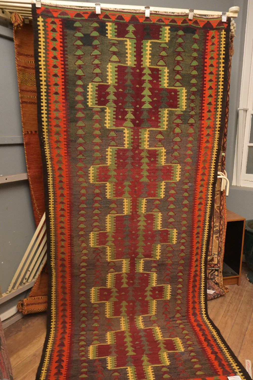 PERSIAN KURDISH COLOURFUL KILIM, GEOMETRIC NOMADIC MOTIFS, 100% HANDMADE WOOLEN WEAVE, ORGANIC DYES. EXCELLENT CONDITION. SIZE: 320 X 148 CM ORIGIN: IRAN– RRP: $1,400 DOCUMENTATION OF AUTHENTICITY INCLUDED.
