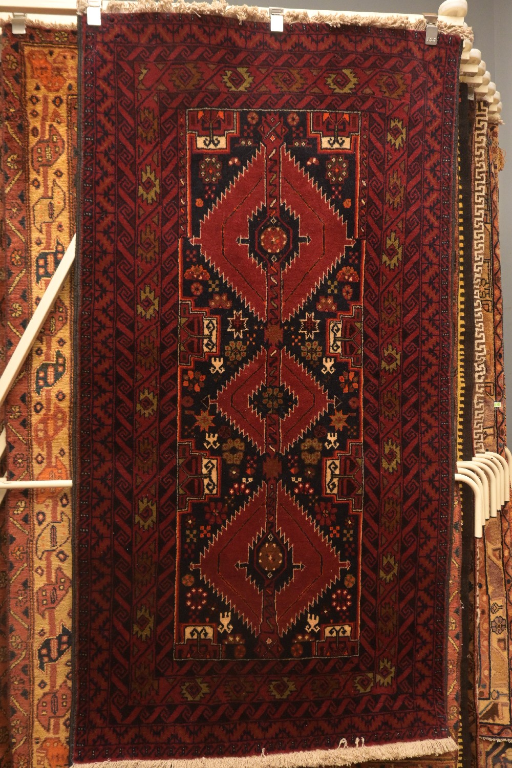 A FINE TRIBAL PERSIAN TURKOMAN RUG. 100% SOLID AND WOOL PILE. FINELY HAND-KNOTTED TRIBAL WEAVE WITH TRIPLE DIAMOND LINKED MEDALLIONS ON A CHARCOAL FIELD OF TRIBAL MOTIFS. SIZE: 190 X 100 CM ORIGIN: PERSIA – RRP: $800 DOCUMENTATION OF AUTHENTICITY INCLUDED