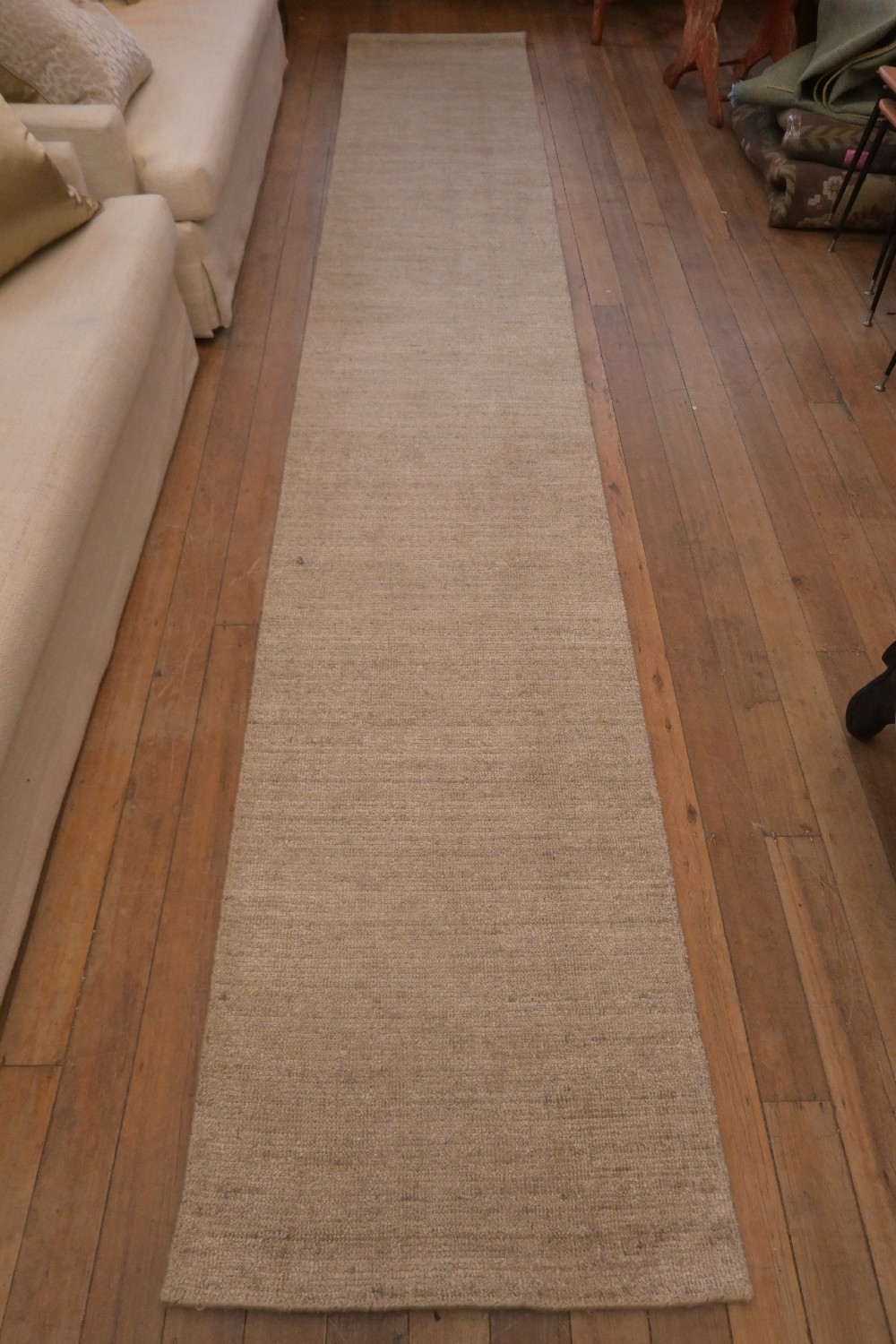 A BRAND NEW MODERN EXTRA LONG RUNNER, HANDLOOMED – WOOL AND BAMBOO SILK, IN NEUTRAL TONES. ORIGIN: INDIA – RRP: $1,200 - SIZE: 490 X 80 CM