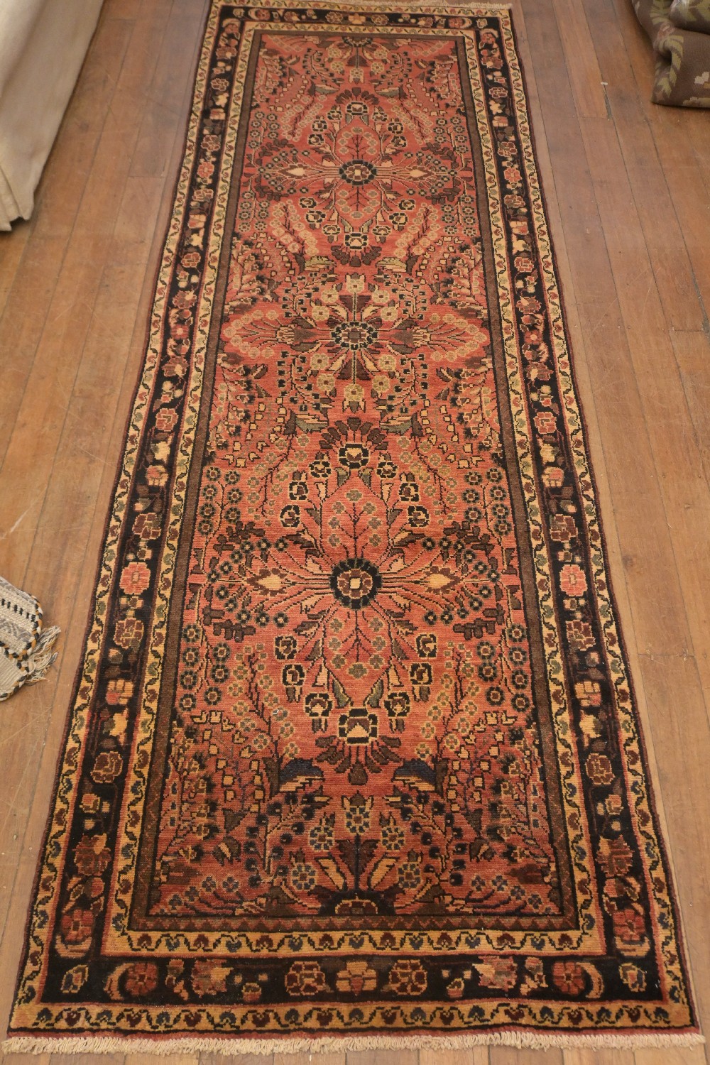 A PERSIAN LILIHAN HALL RUNNER, 100% HAND SPUN WOOL, NATURAL DYES. HAND-KNOTTED WEAVE FROM THE KHOMEYN REGION WITH TRADITIONAL DESIGN OF CONTINUING FLORAL MEDALLIONS, FLORAL SPRAYS TENDRILS AND FLORAL BUNCHES ON A MELLOWED, RED-TONED FIELD. FLORAL BORDERS. SEMI VINTAGE PILE. SIZE: 312 X 102 CM ORIGIN: PERSIA – RRP: $1,300 DOCUMENTATION OF AUTHENTICITY INCLUDED.