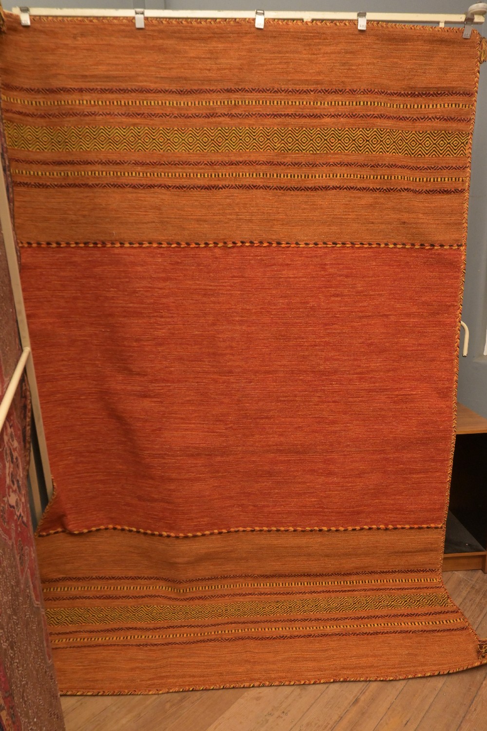 A BRAND-NEW COLOURFUL, DENSELY HAND-WOVEN RAJASTHANI KILIM RUG. VERY DURABLE AND SOFT TO WALK ON, REVERSABLE. MADE FROM THE FINEST COTTON FLEECE. IN TONES OF RED AND TERRACOTTA. SIZE: 200 X 300 CM-ORIGIN: JAIPUR – RRP: $1,100 DOCUMENTATION OF AUTHENTICITY INCLUDED