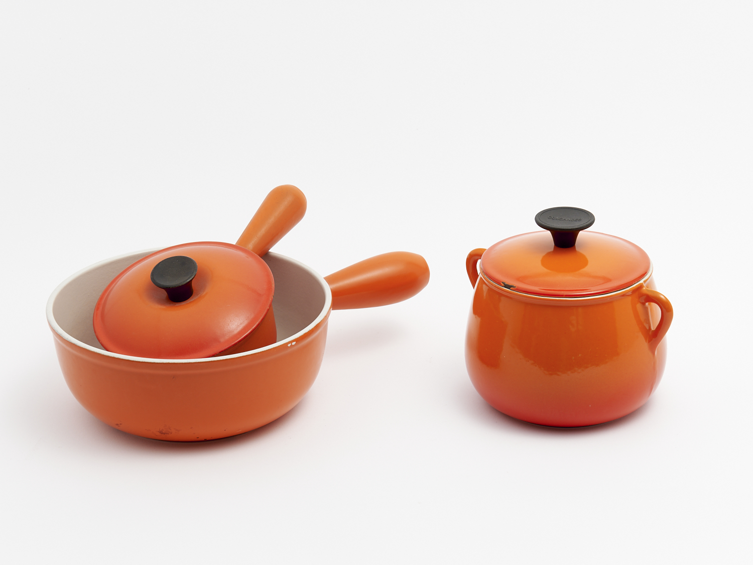 TWO PIECES OF LE CREUSET ENAMEL COOKWARE AND A COUSANCES LIDDED ENAMEL POT L.32CM (LARGEST), LEONARD JOEL DELIVERY SIZE: MEDIUM