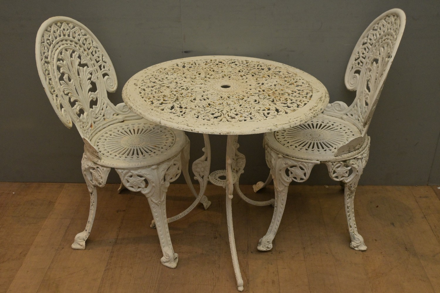 A THREE PIECE CAST IRON AND METAL THREE PIECE OUTDOOR SETTING (A/F) (TABLE 67H X 70D CM) (LEONARD JOEL DELIVERY SIZE: X-LARGE)