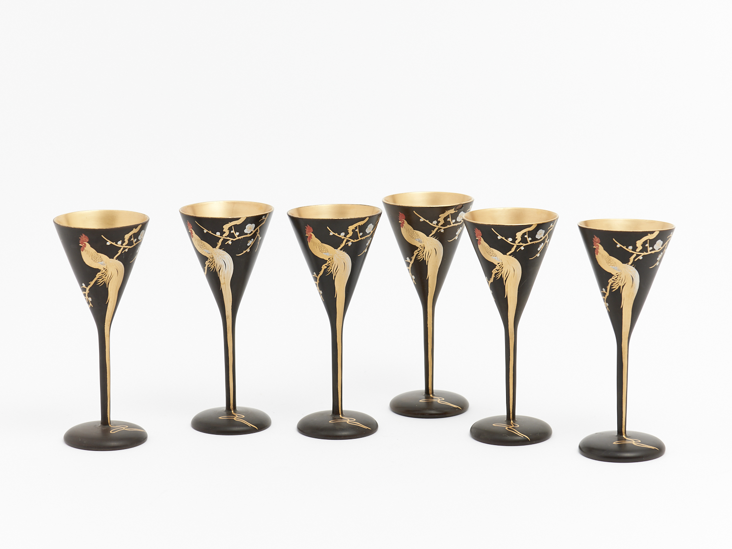 SIX LACQUERED GILT COCKEREL DECORATED COCKTAIL GLASSES H.14.5CM, LEONARD JOEL DELIVERY SIZE: SMALL