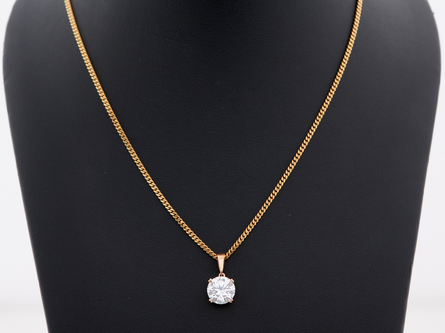 A MOISSANITE PENDANT IN 18CT ROSE GOLD, TO A CHAIN IN 18CT GOLD, 610MM, 13.6GMS