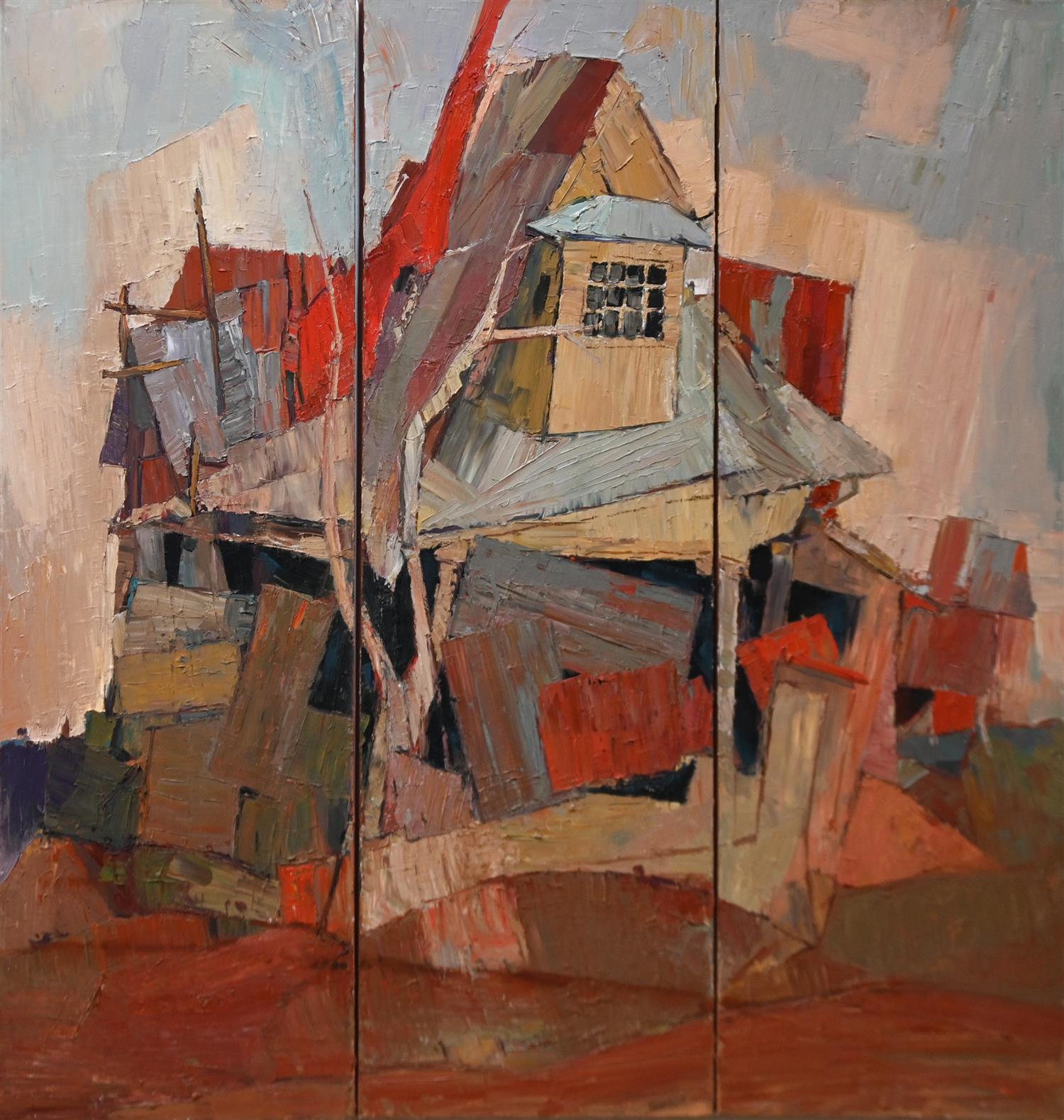 OTTO BORON, BARRICADED 2009, OIL ON CANVAS, TRIPTYCH, SIGNED AND DATED ON CENTRE PANEL, 122 X 122.5CM