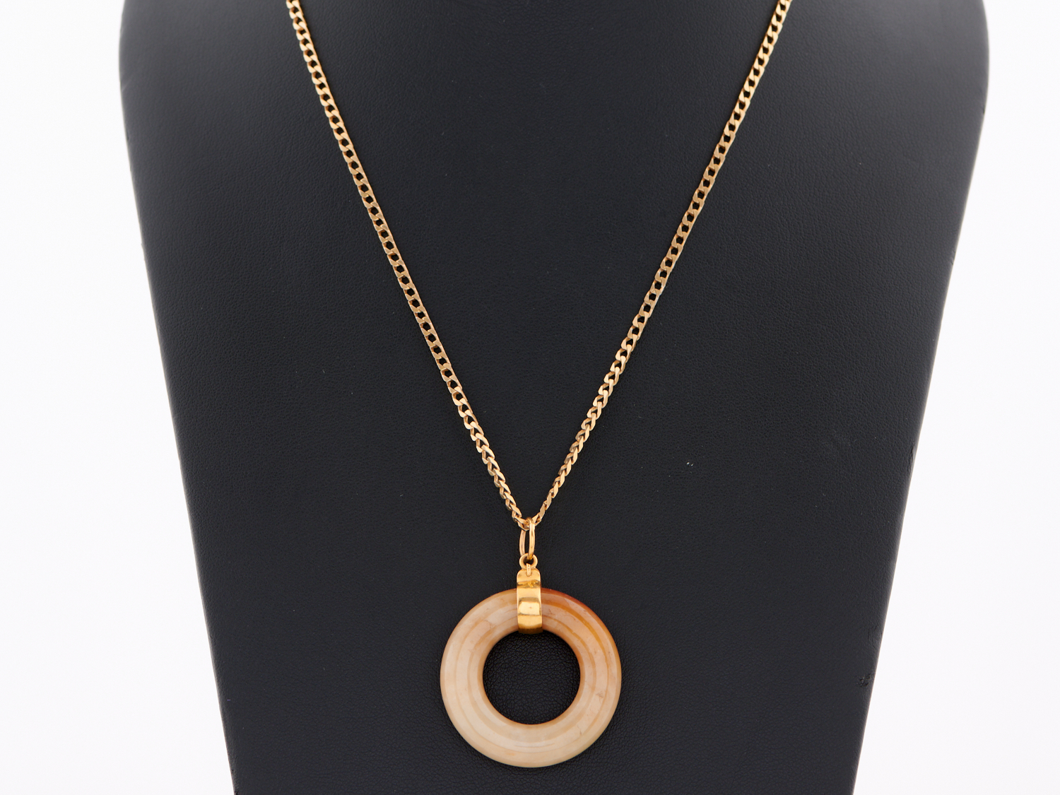 AN OPEN WORK JADE PENDANT TO A CHAIN IN 14CT GOLD, CHAIN WEIGHT 9.4GMS