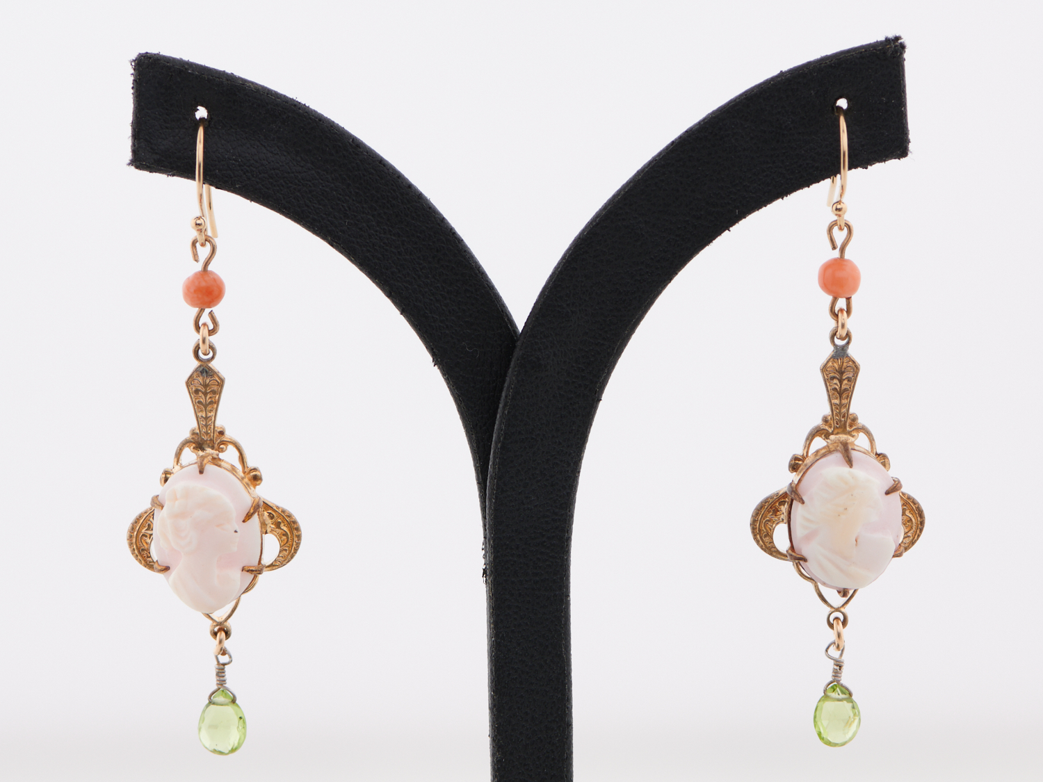 A PAIR OF VINTAGE CORAL AND PERIDOT CAMEO EARRINGS IN GOLD PLATE, TO SHEPHERD HOOK FITTINGS