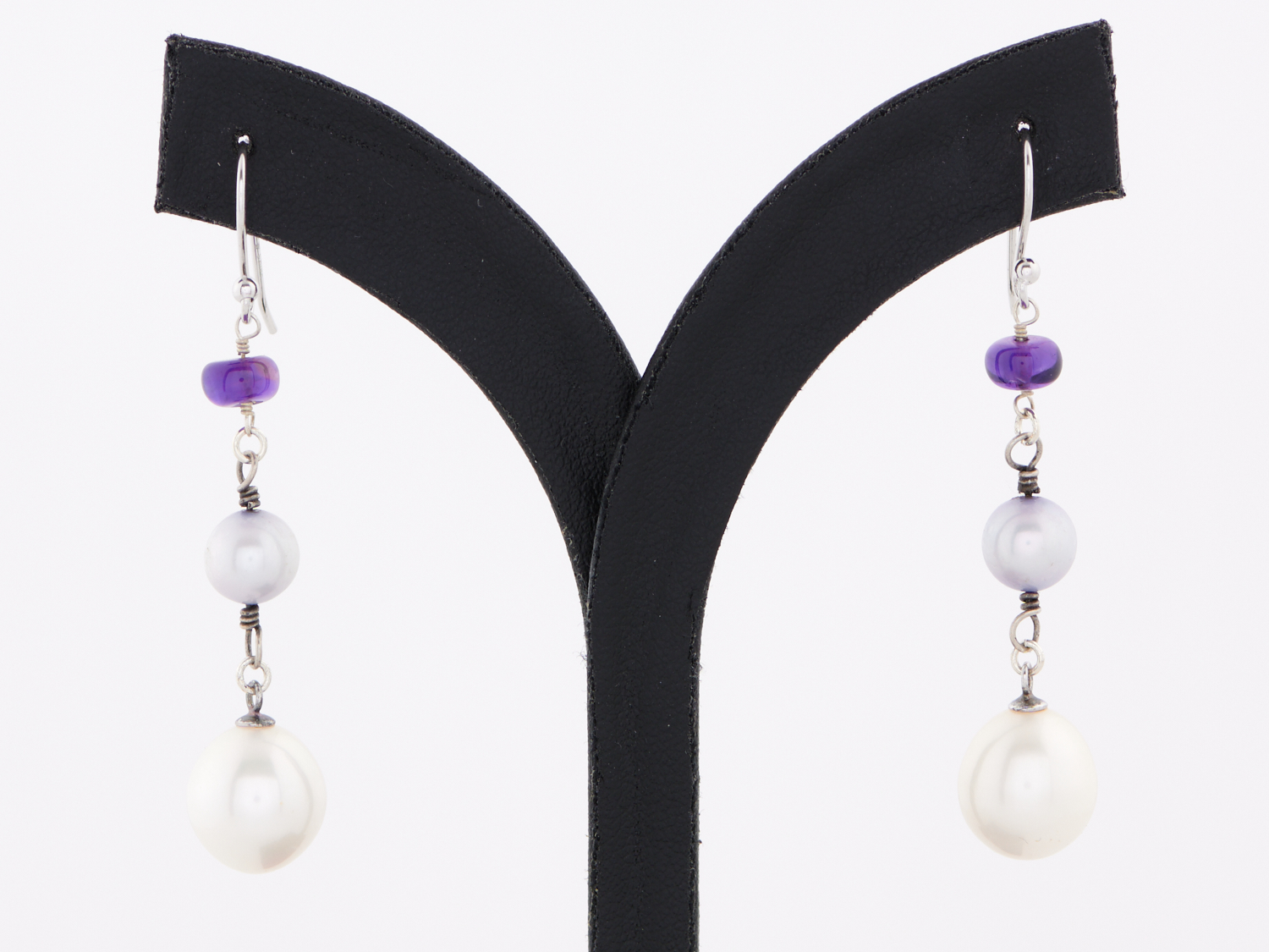 A PAIR OF CULTURED PEARL AND AMETHYST DROP EARRINGS IN SILVER, TO SHEPHERD HOOK FITTINGS