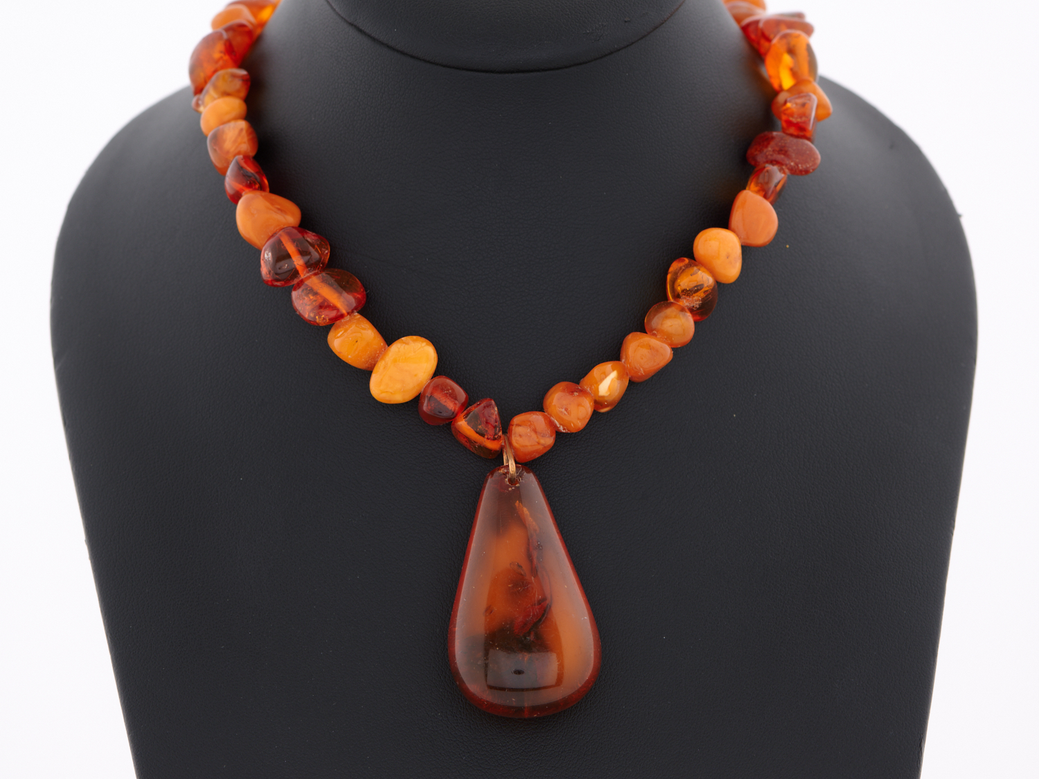 A VINTAGE STRAND OF TUMBLED AMBER BEADS TO A LARGE AMBER PENDANT