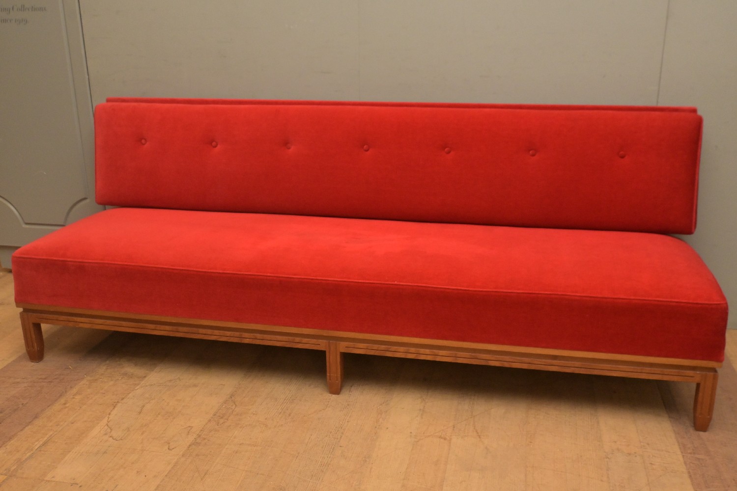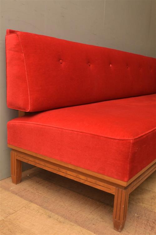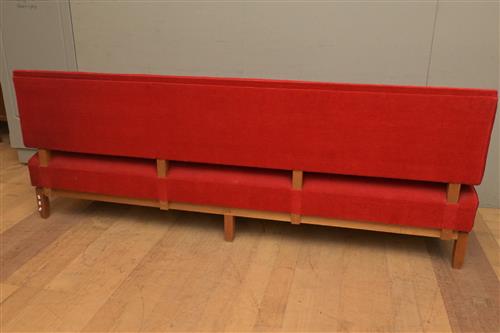 A LARGE SETTEE ATRIBUTED TO RODOWSKI UPHOLSTERED IN A RED VELVET (86H X 231W X 77D CM) (PLEASE NOTE THIS HEAVY ITEM MUST BE REMOVED BY CARRIERS AT THE CUSTOMER'S EXPENSE. LEONARD JOEL STAFF CANNOT ASSIST CARRYING THIS ITEM) (LARGE ITEM)
