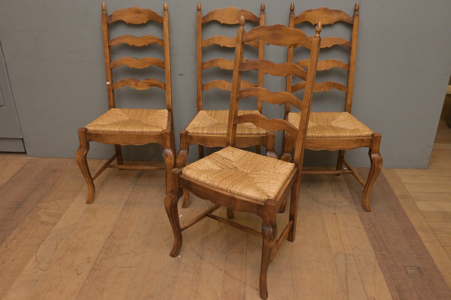 A SET OF FOUR LADDERBACK DINING CHAIRS WITH RUSH SEATS (111H X 57W X 57D CM) (LEONARD JOEL DELIVERY SIZE: X-LARGE)