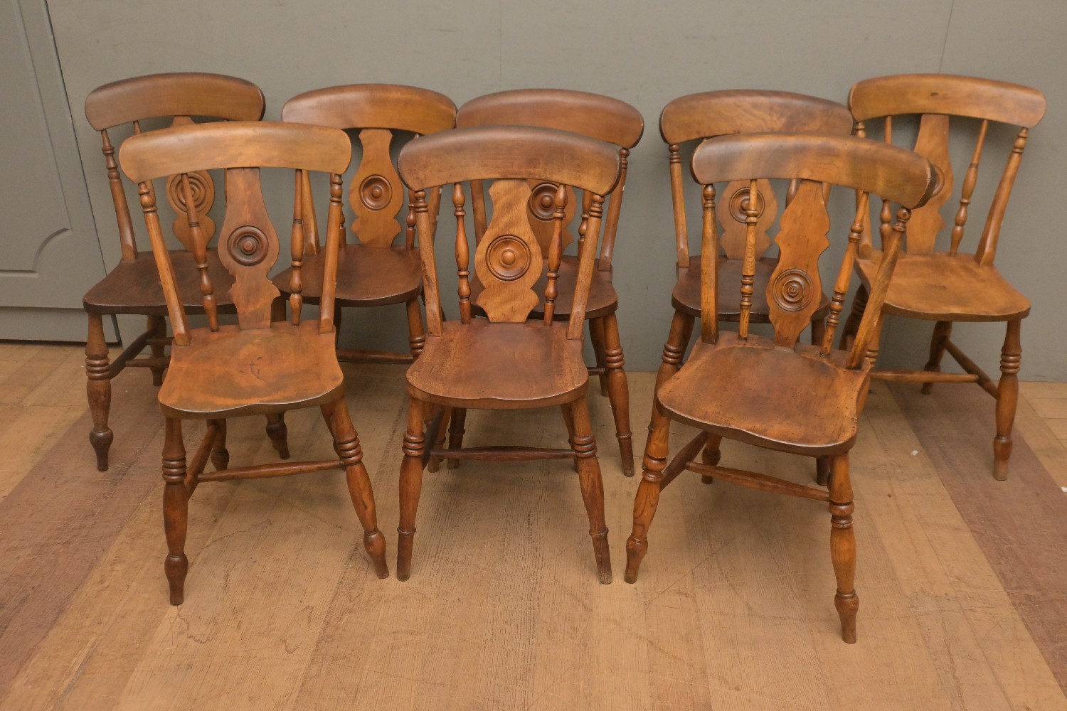 A HARLEQUIN SET OF EIGHT ELM COTTAGE CHAIRS (A/F) (85H X 38W X 52D CM) (PLEASE NOTE THIS HEAVY ITEM MUST BE REMOVED BY CARRIERS AT THE CUSTOMER'S EXPENSE. LEONARD JOEL STAFF CANNOT ASSIST CARRYING THIS ITEM) (LARGE ITEM)
