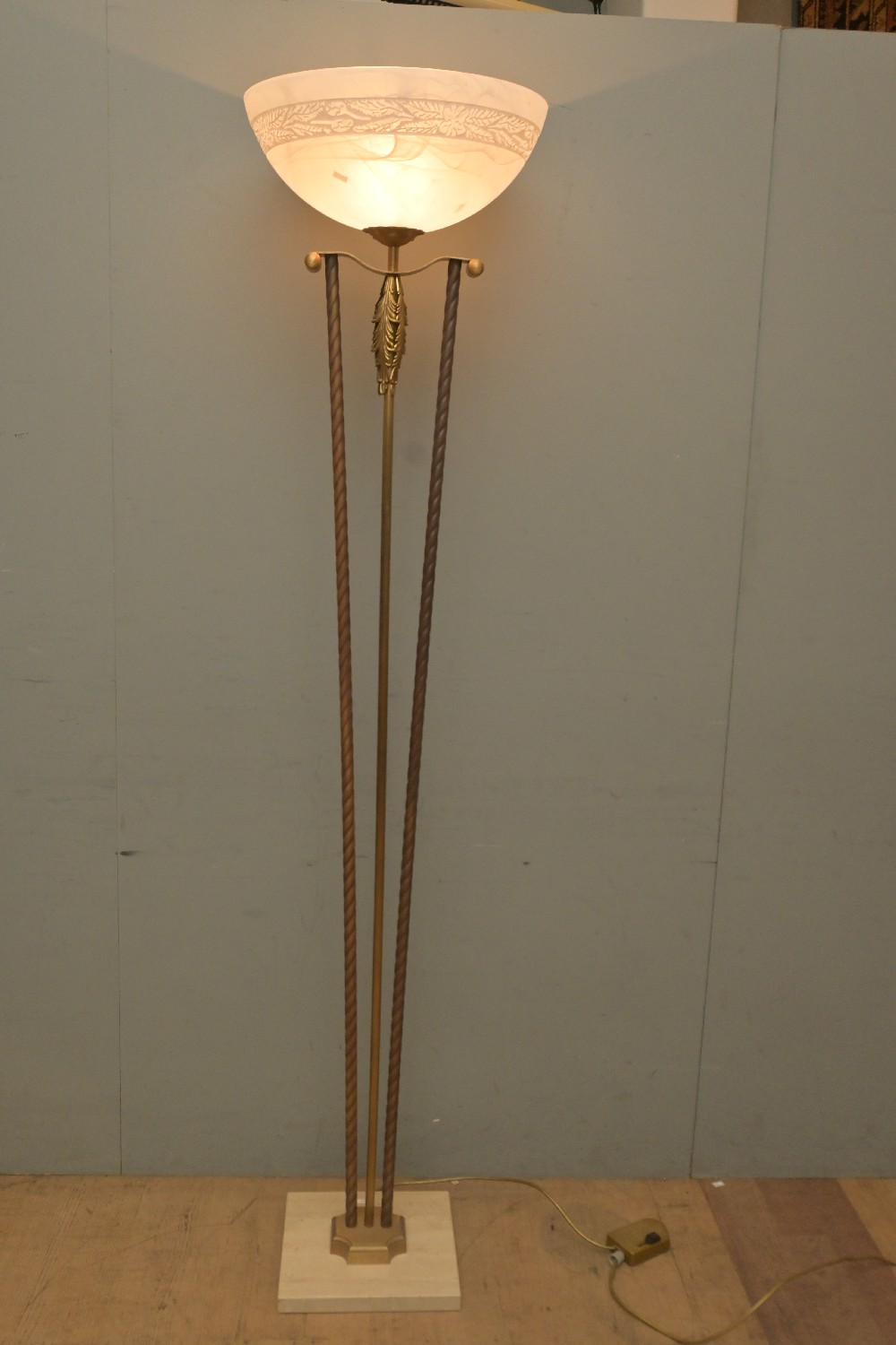 AN ITALIAN STONE AND BRASS EFFECT DIMMABLE LAMP WITH FROSTED GLASS SHADE (190H CM) (LEONARD JOEL DELIVERY SIZE: X-LARGE)