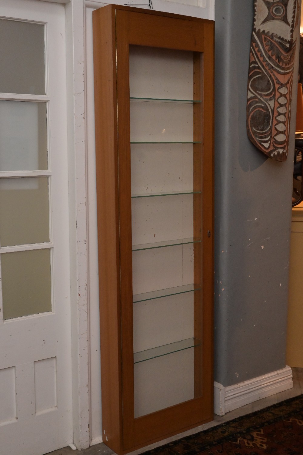 A TALL AUSTRALIAN ASH DISPLAY CABINET WITH SIX SHELVES (209H X 61W X 17D CM) (PLEASE NOTE THIS HEAVY ITEM MUST BE REMOVED BY CARRIERS AT THE CUSTOMER'S EXPENSE. LEONARD JOEL STAFF CANNOT ASSIST CARRYING THIS ITEM) (LARGE ITEM)