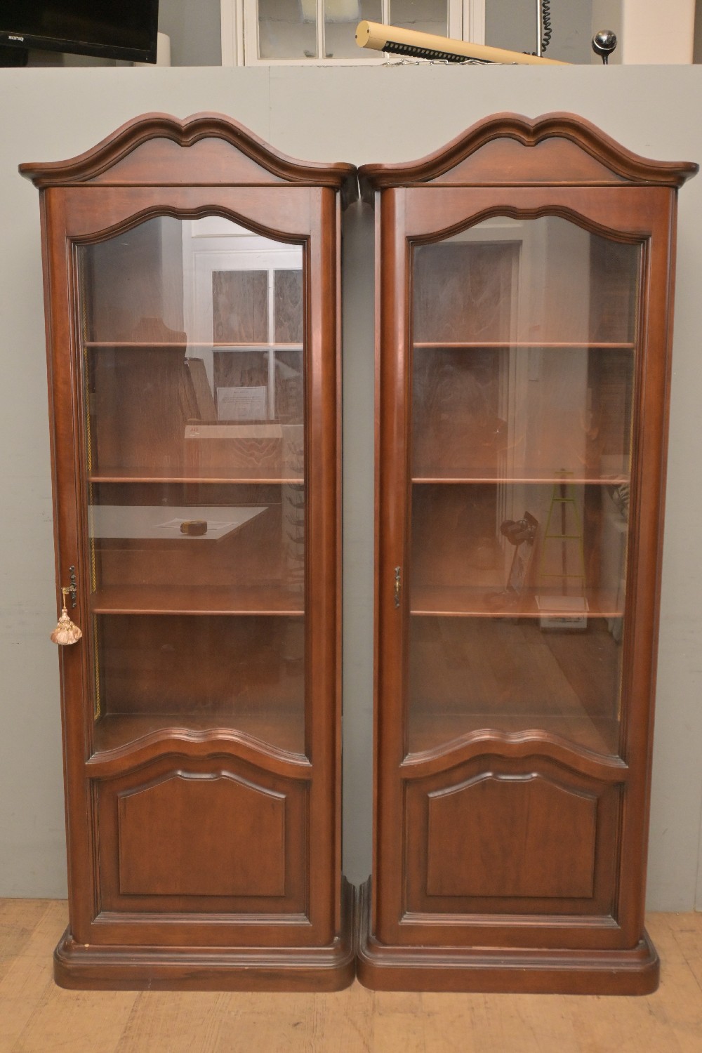 A PAIR OF MAHOGANY SINGLE DOOR GLAZED BOOKCASES - KEYS IN OFFICE (A/F) (192H X 69W X 37D CM) (PLEASE NOTE THIS HEAVY ITEM MUST BE REMOVED BY CARRIERS AT THE CUSTOMER'S EXPENSE. LEONARD JOEL STAFF CANNOT ASSIST CARRYING THIS ITEM) (LARGE ITEM)