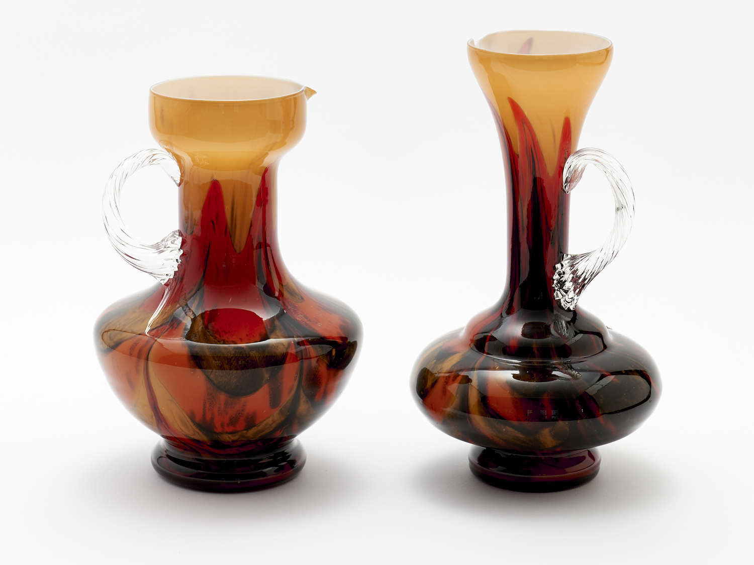 A PAIR OF ITALIAN ART GLASS HANDLED JUG VASES WITH ORIGINAL SILVER FOIL LABELS H.27CM (TALLEST), LEONARD JOEL DELIVERY SIZE: MEDIUM