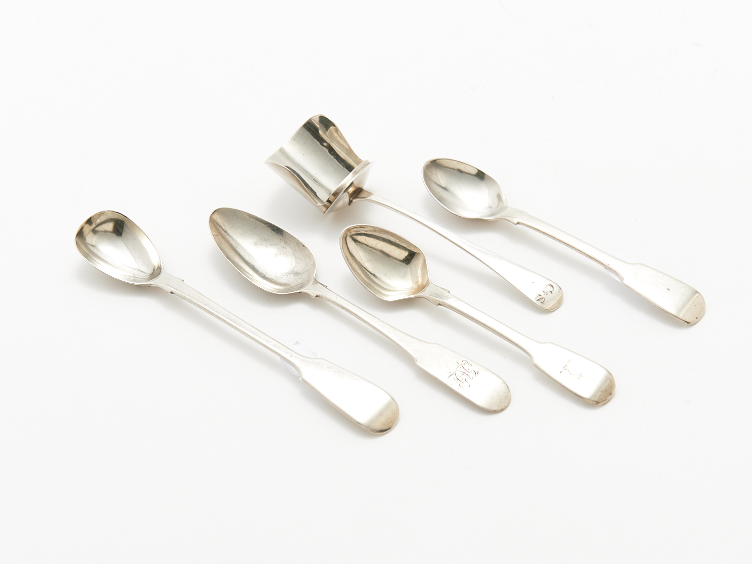 A GROUP OF EARLY GEORGIAN HALLMARKED STERLING SILVER SERVING SPOONS INCLUDING SUGAR SCUTTLE 105G L.14CM (LONGEST), LEONARD JOEL DELIVERY SIZE: SMALL