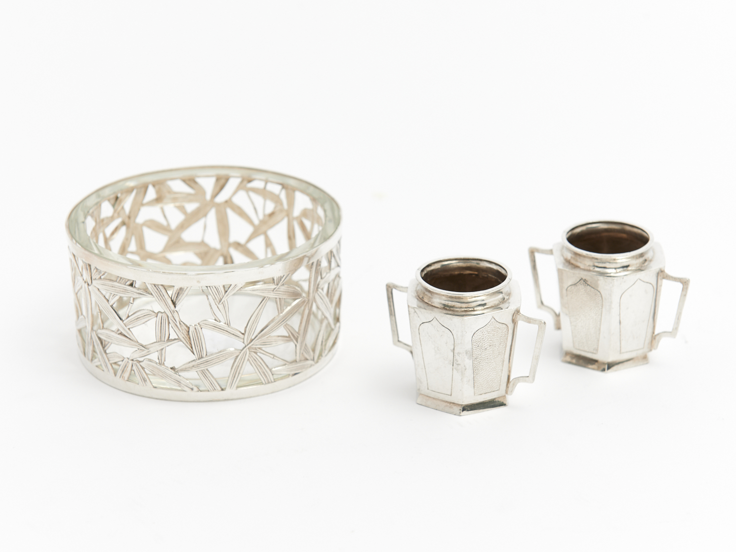 THREE HALLMARKED CHINESE STERLING SILVER ITEMS INCLUDING A PAIR OF CRUETS AND A BAMBOO GLASS LINED DECORATED BOWL, WEIGHT OF SILVER 87G DIA.8.5CM (BOWL), LEONARD JOEL DELIVERY SIZE: SMALL
