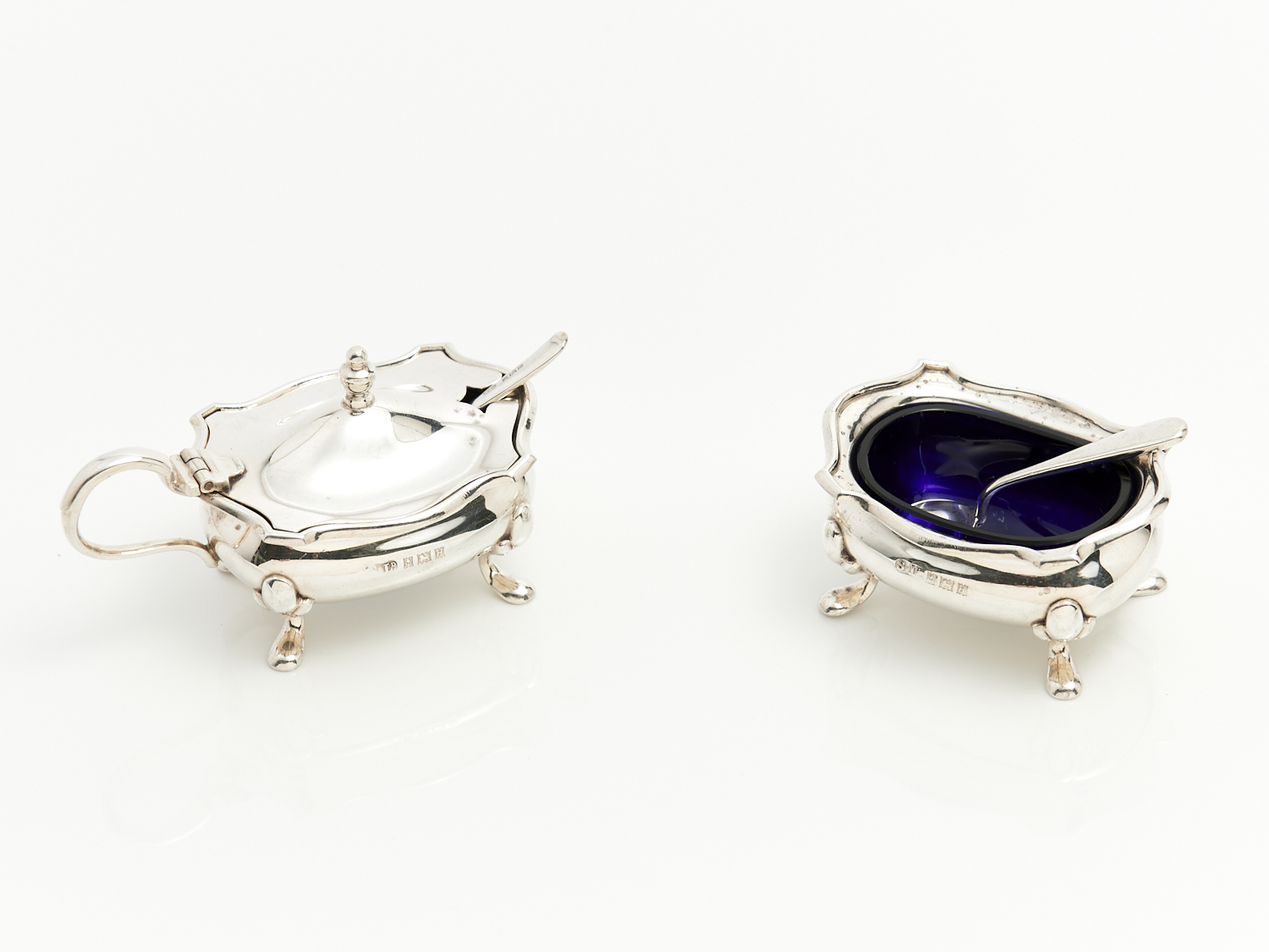 A PAIR OF HALLMARKED ENGLISH STERLING SILVER CRUET SALT AND PEPPER SETS WITH STERLING SILVER SPOONS AND BLUE GLASS LINERS 172G L.8.5CM (LONGEST), LEONARD JOEL DELIVERY SIZE: SMALL