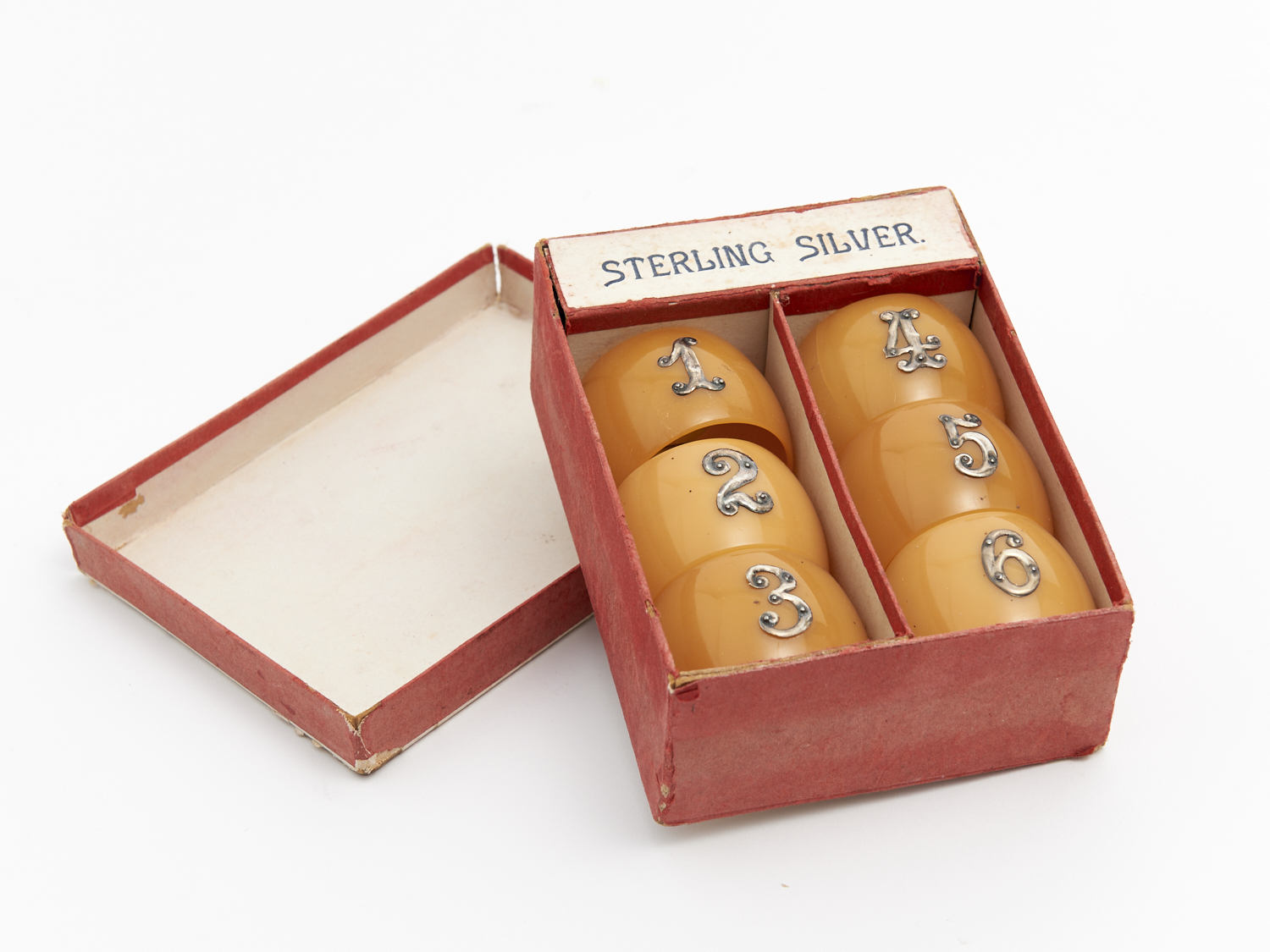 A CASED SET OF 1920S BAKELITE NAPKIN RINGS WITH STERLING SILVER CHRONOLOGICAL NUMBERS 1 TO 6 L.14CM (BOX), LEONARD JOEL DELIVERY SIZE: SMALL