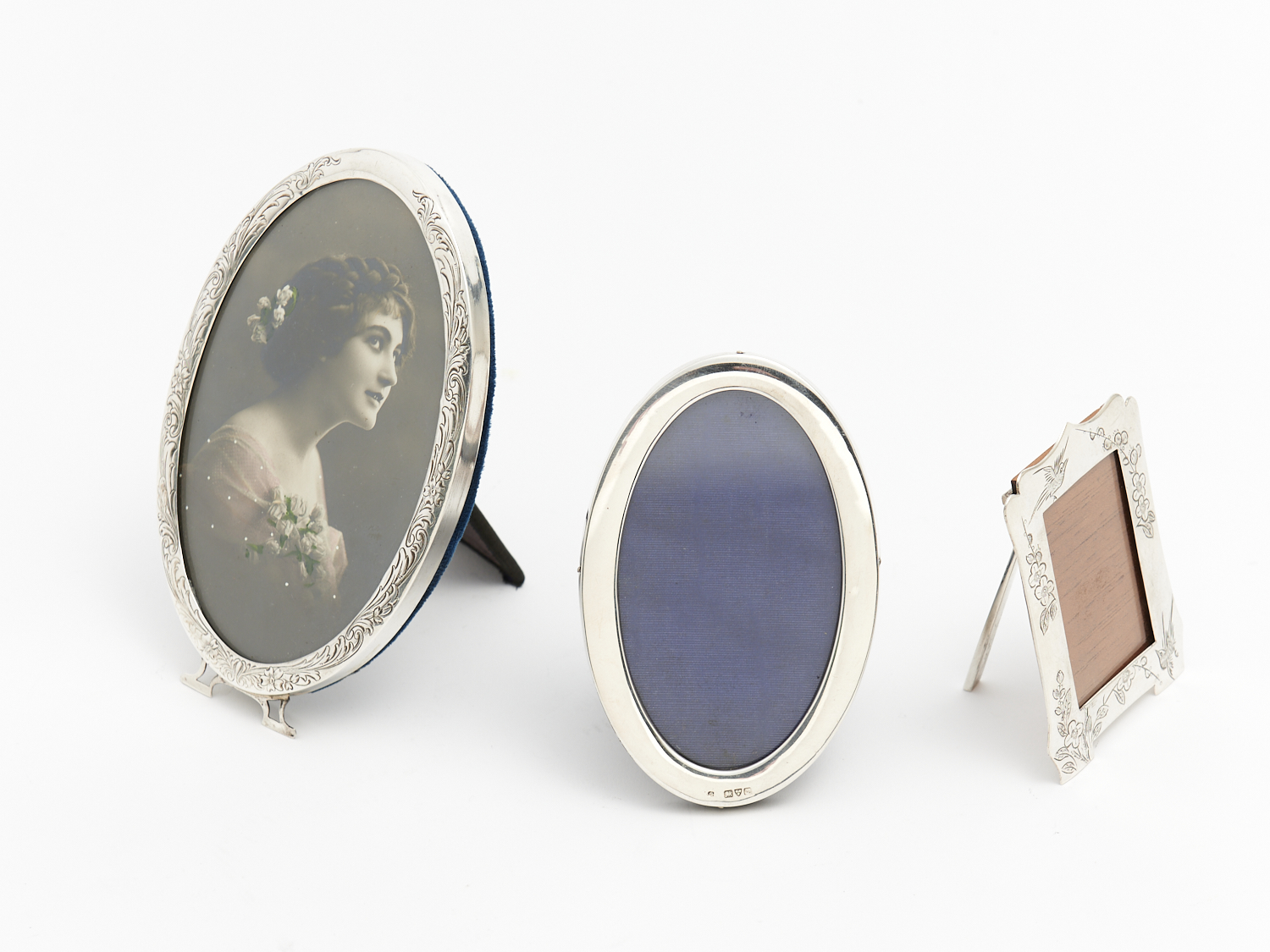 A GROUP OF THREE STERLING SILVER PHOTO FRAMES INCLUDING ENGLISH HALLMARKED, AMERICAN AND CHINESE H.14.5CM (TALLEST), LEONARD JOEL DELIVERY SIZE: SMALL