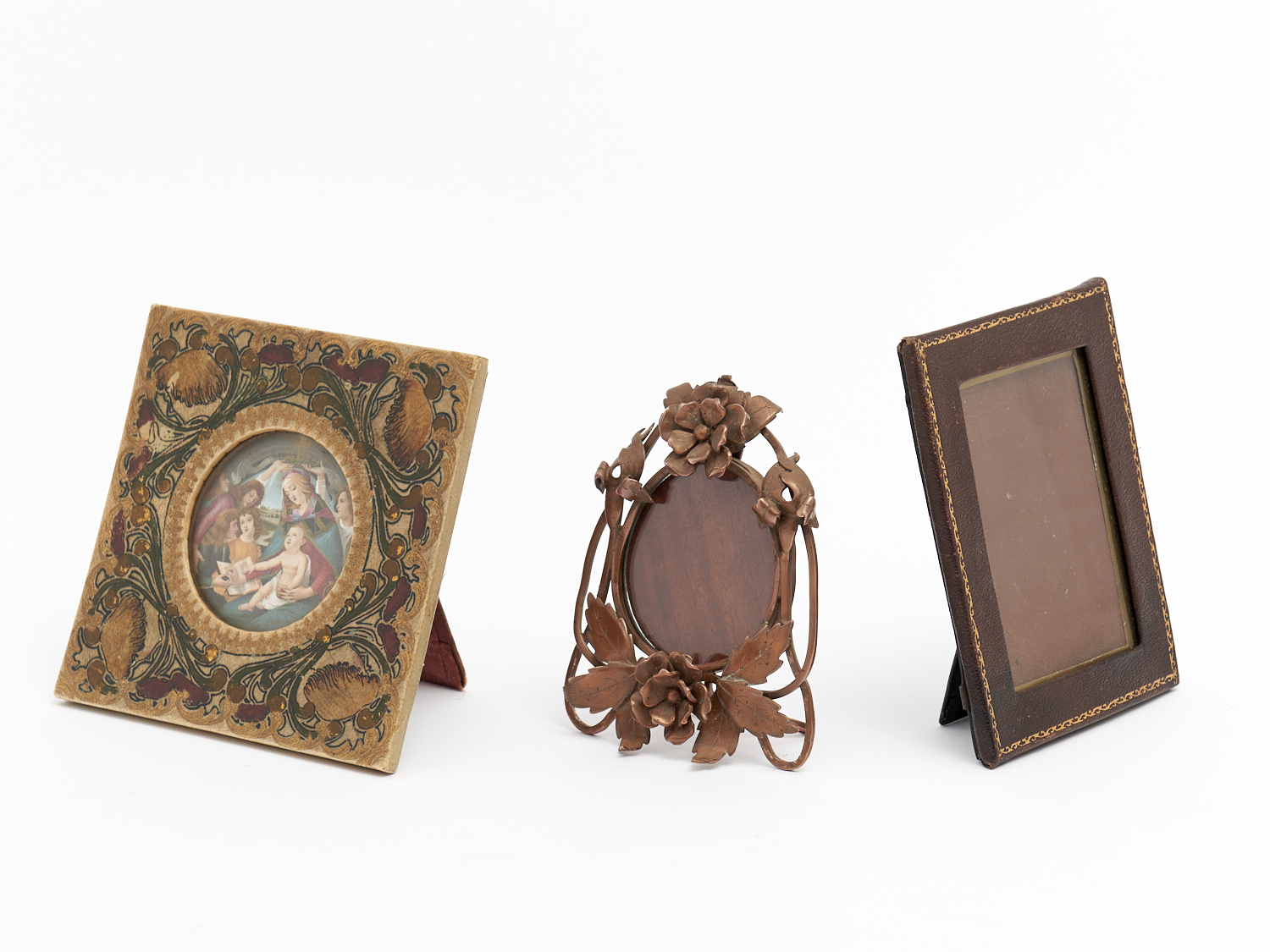 A GROUP OF THREE ANTIQUE FRAMES INCLUDING HAND COLOURED VELLUM COPPER FLORAL AND LEATHER H.11.5CM (TALLEST)