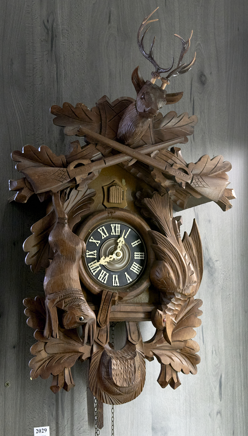 A GERMAN CARVED WOODEN CUCKOO CLOCK WITH ANIMAL DECORATIONS AND DEER PENDAMENT (HORNS REQUIRING FULL INSERTION) H.41CM, LEONARD JOEL DELIVERY SIZE: LARGE