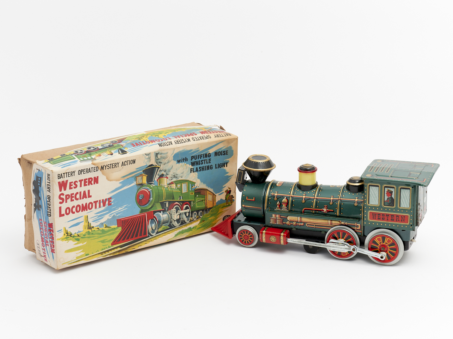 A CASED BATTERY OPERATED JAPANESE WESTERN SPECIAL LOCOMOTIVE TIN TRAIN IN ORIGINAL BOX L.35.5CM, LEONARD JOEL DELIVERY SIZE: SMALL