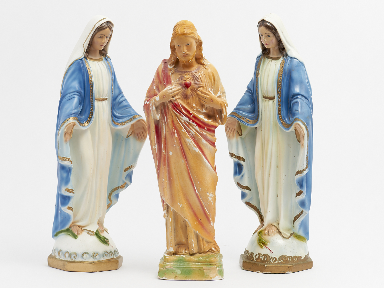 A GROUP OF THREE 1940S ITALIAN HAND PAINTED PLASTER RELIGIOUS FIGURES INCLUDING JESUS AND TWO MARYS H.43CM
