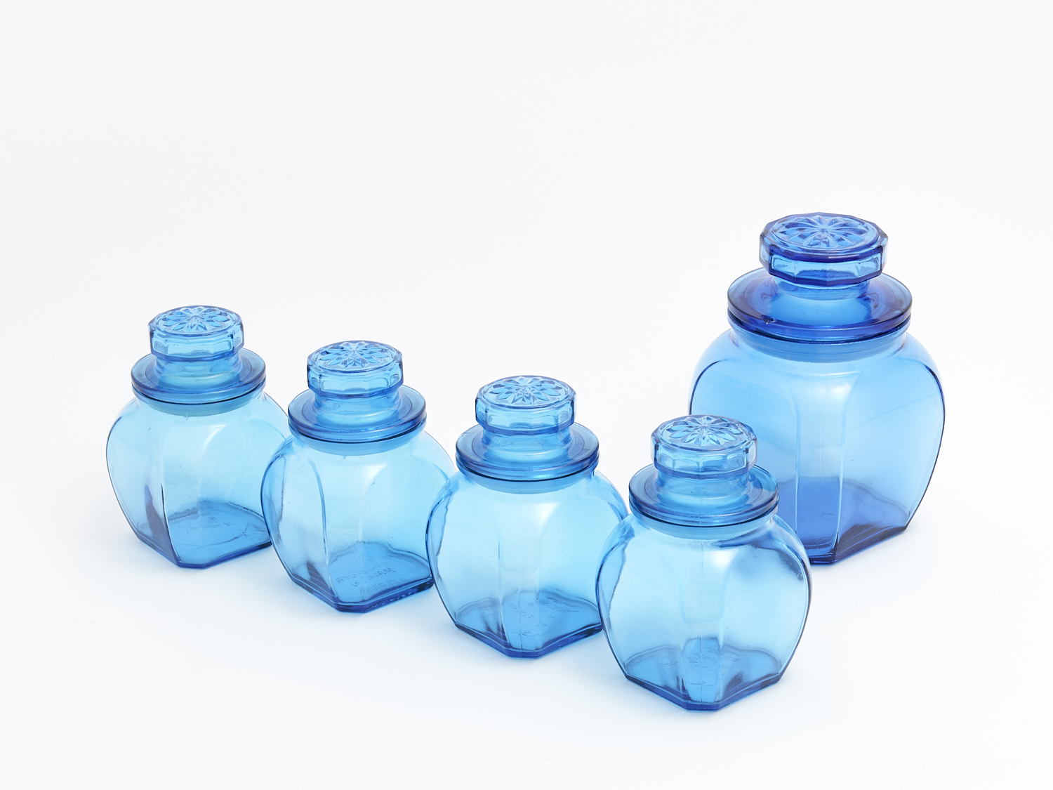 A SET OF FIVE BLUE GLASS BELGIAN CANISTERS H.19.5CM (TALLEST), LEONARD JOEL DELIVERY SIZE: LARGE