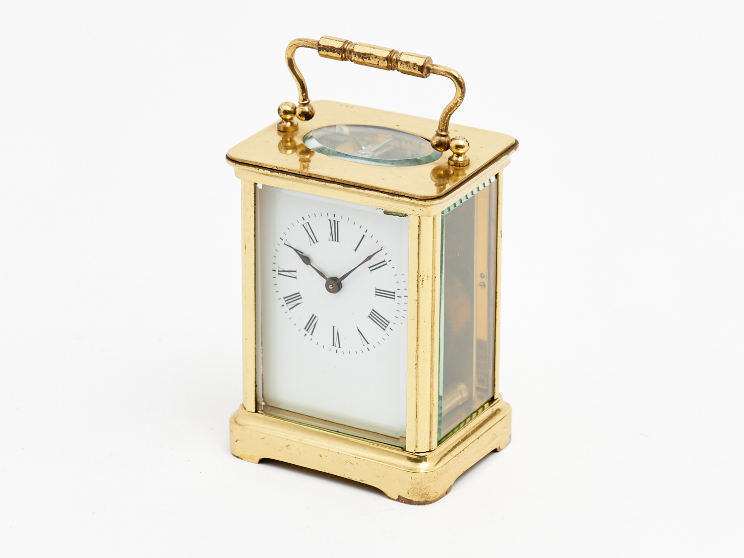 A 19TH CENTURY ENGLISH BRASS CASED WHITE ENAMEL DIAL CARRIAGE CLOCK H.10.5CM, LEONARD JOEL DELIVERY SIZE: SMALL