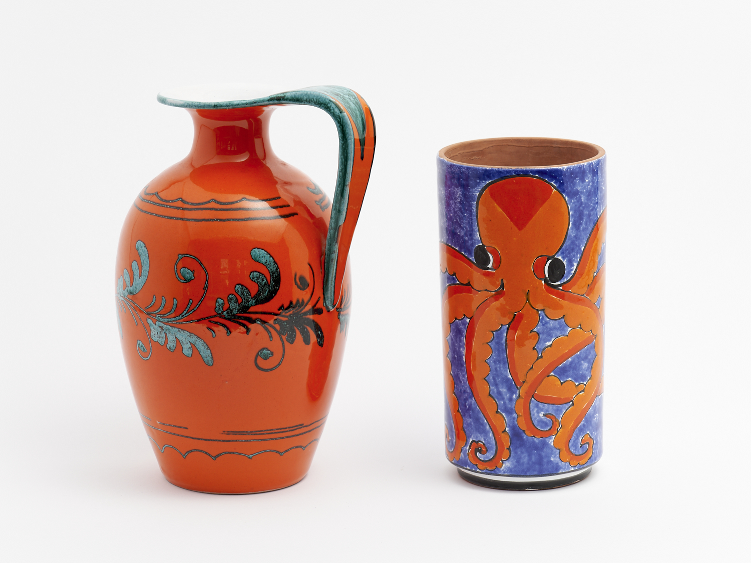 TWO RETRO 1960S ITALIAN ORANGE AND BLUE GLAZED POTTERY VASES INCL. ONE SIGNED BY NINO PARRUCCA H.29CM (TALLEST), LEONARD JOEL DELIVERY SIZE: MEDIUM