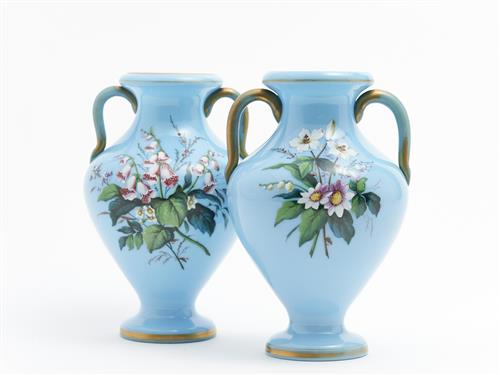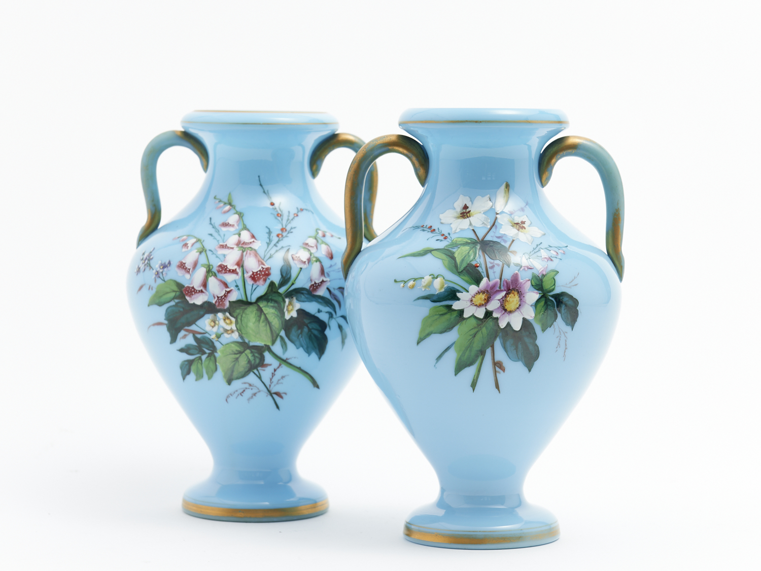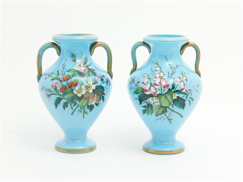 A PAIR OF 19TH CENTURY AQUA GLASS VASES WITH RAISED ENAMEL FLORAL DECORATION H.21CM, LEONARD JOEL DELIVERY SIZE: MEDIUM