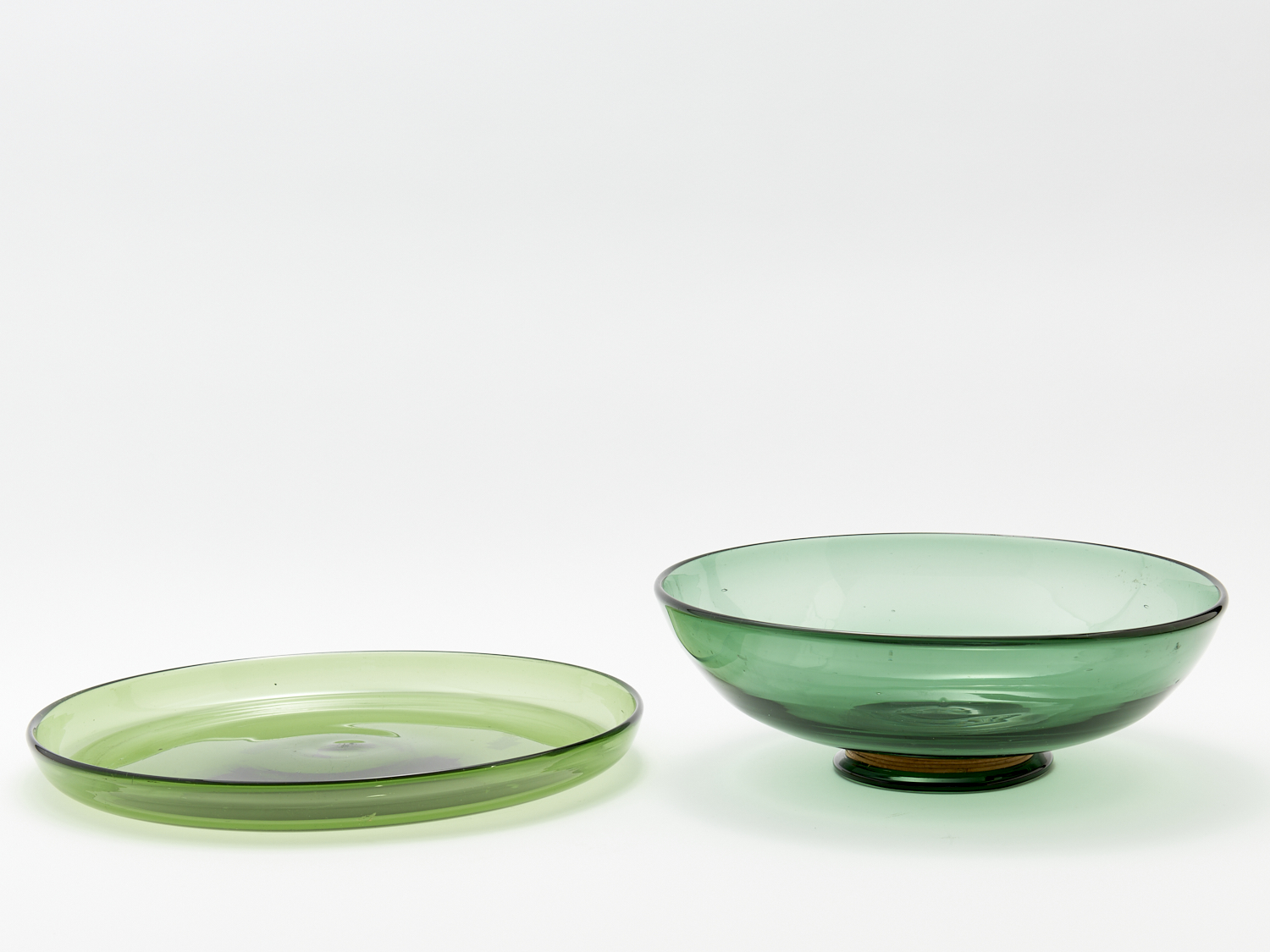 TWO PIECES OF SWEDISH GREEN GLASS INCL. SERVING PLATTER AND BOWL WITH WOVEN CANE SURROUND DIA.34CM (LARGEST), LEONARD JOEL DELIVERY SIZE: MEDIUM