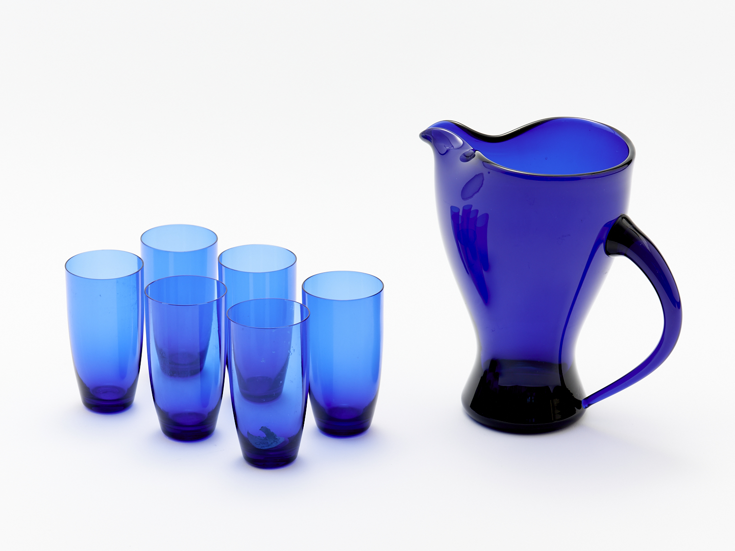 A 1960S SWEDISH DEEP BLUE SEVEN PIECE GLASS JUG AND GLASS SET H.18.5CM (JUG), LEONARD JOEL DELIVERY SIZE: LARGE