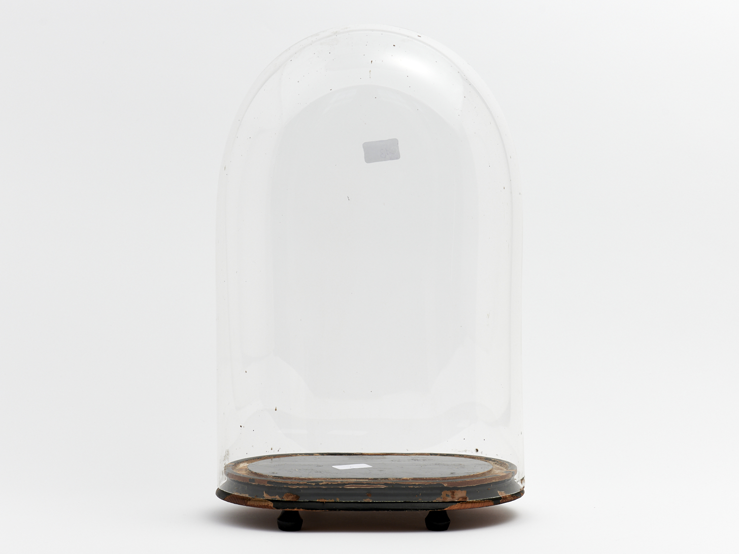 A 19TH CENTURY FRENCH OVAL GLASS DISPLAY DOME ON EBONISED WOODEN BASE H.43CM, LEONARD JOEL DELIVERY SIZE: LARGE