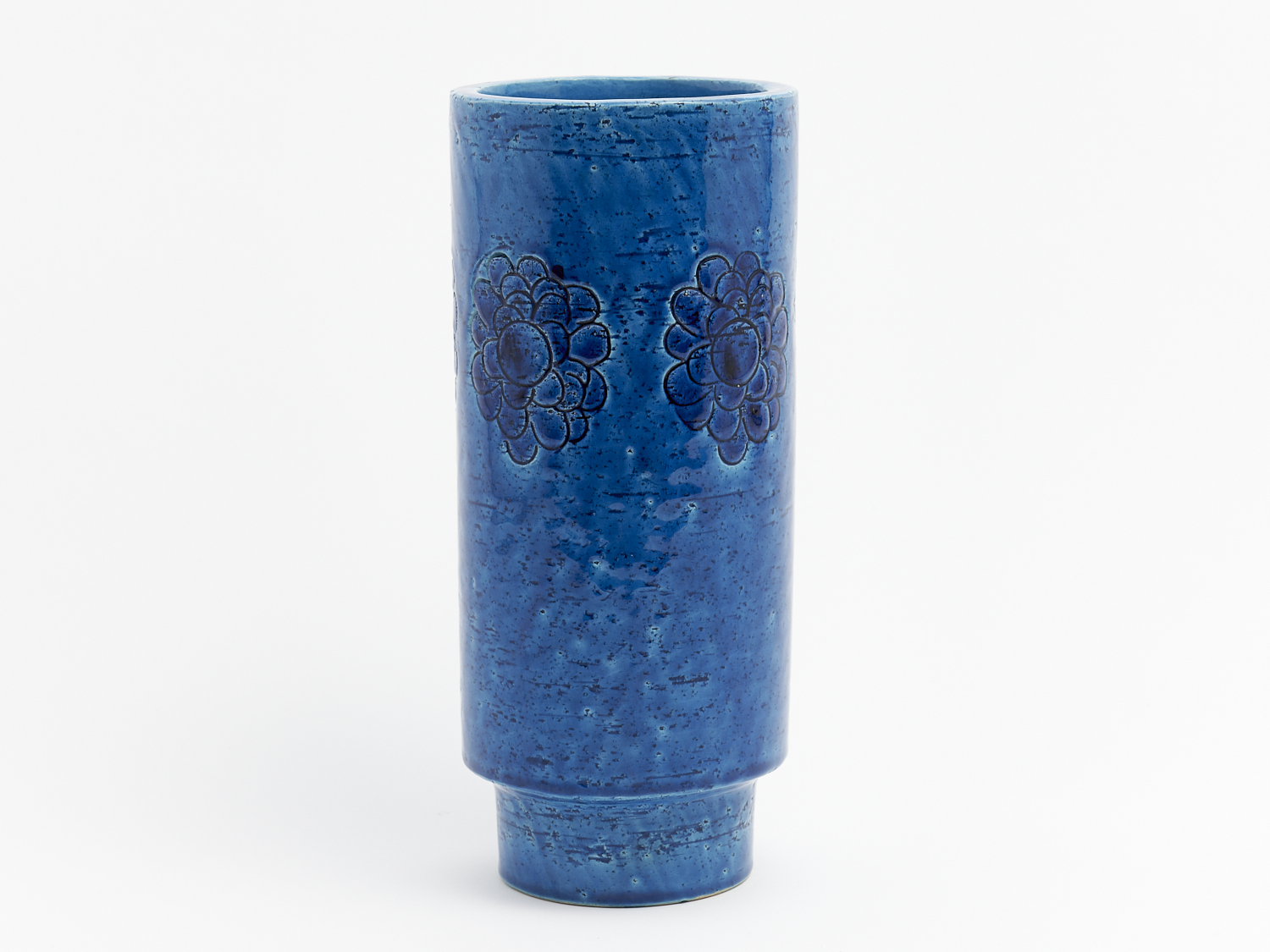 A 1950S ITALLIAN BITOSSI FLORAL PRESED CYLINDRICAL POTTERY VASE WITH ORIGINAL PAPER LABEL TO BASE H.26.5CM, LEONARD JOEL DELIVERY SIZE: SMALL